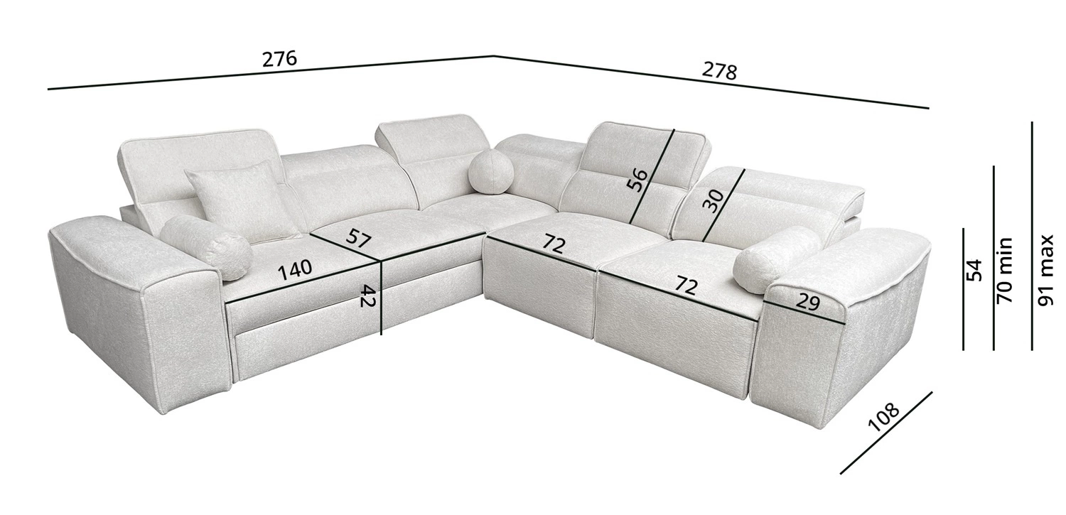 Rozměry nábytku umožňují plánování prostoru v menším obývacím pokoji. Šířka rohu 276 cm, výška 91 cm a hloubka 278 cm. Spací plocha rohové jednotky je 127x198 cm. Výška sedadla nábytku je 42 cm a výška opěradla je 56 cm. Vlnité pružiny a polyuretanová pěna T30 je materiál, z něhož je vyrobeno sedadlo rohu. Pevné opěradlo s nastavitelnými opěrkami hlavy umožní snadné adaptace úhel opěrek hlavy podle vašich preferencí a zaručí vám pohodlný odpočinek po dlouhém dni, který oceníte vy, vaši blízcí i hosté, kteří si na tuto jedinečnou rohovou pohovku sednou.