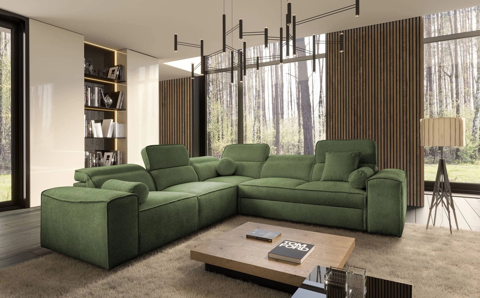 Rohová sedací souprava s funkcí spaní Viano III zelená levá Stylová rohová sedací souprava s kontejnery na lůžkoviny ideální pro moderní interiéry