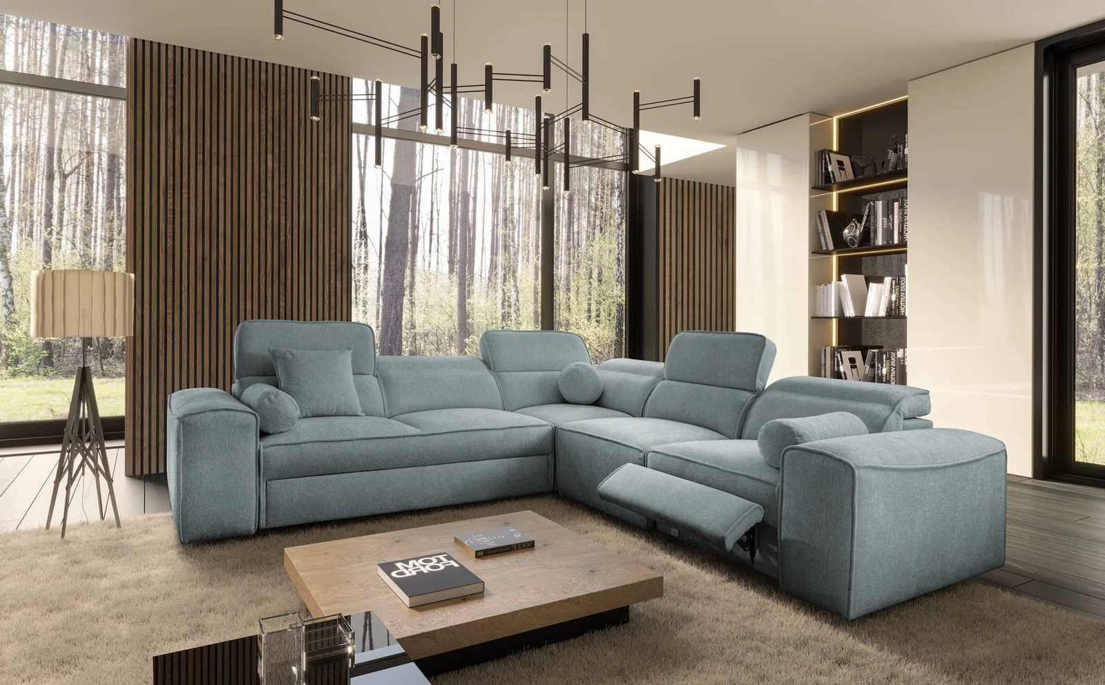 Rozkládací pohovka Viano III Lux v šedomodré barvě s výsuvnou podnožkou je zajímavě vypadající kus nábytku s elegantní povrchovou úpravou.