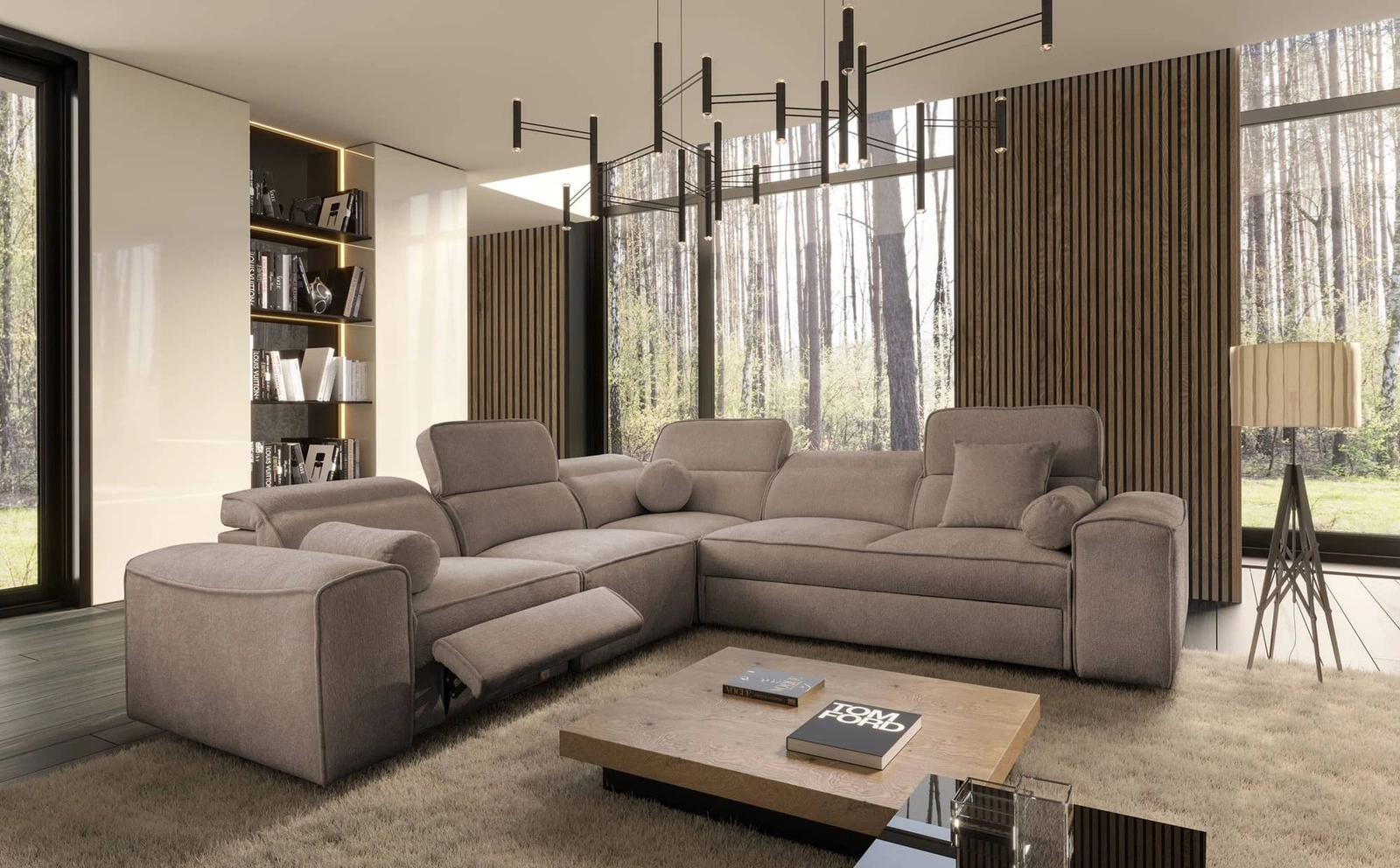 Rozkládací pohovka Viano III Lux ve světle hnědé barvě s výsuvnou podnožkou je zajímavě vypadajícím kusem nábytku s elegantním povrchem.