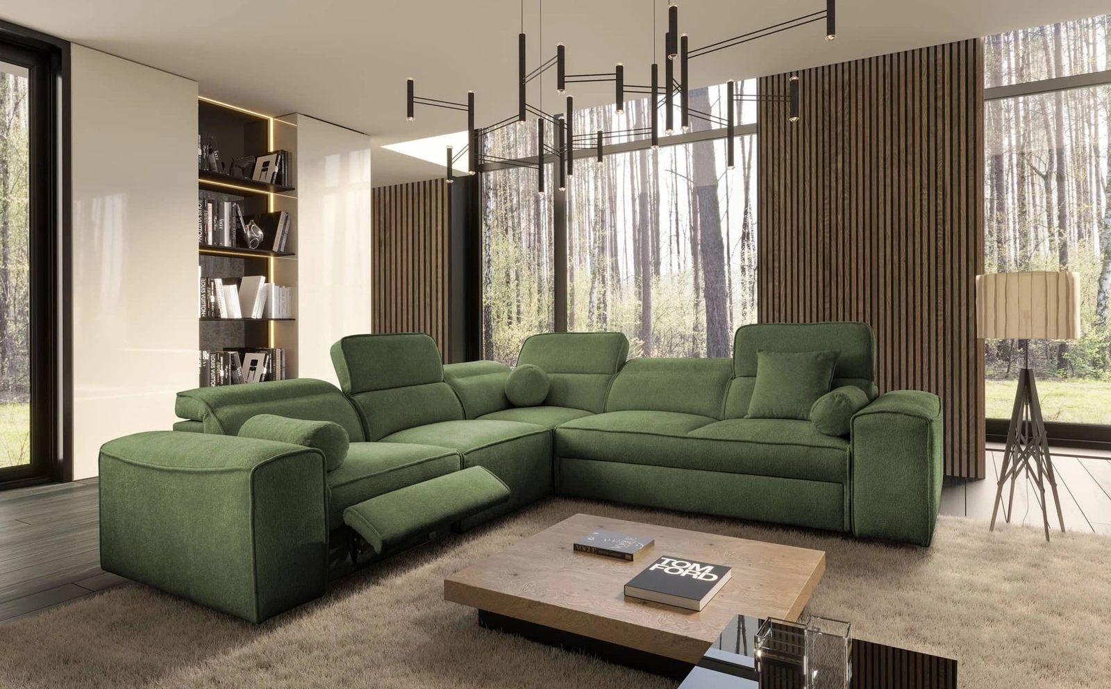 Rohová sedačka s funkcí spaní Viano III Lux zelená levá moderní rohová sedačka do obývacího pokoje s výsuvnou podnožkou kontejner na ložní prádlo