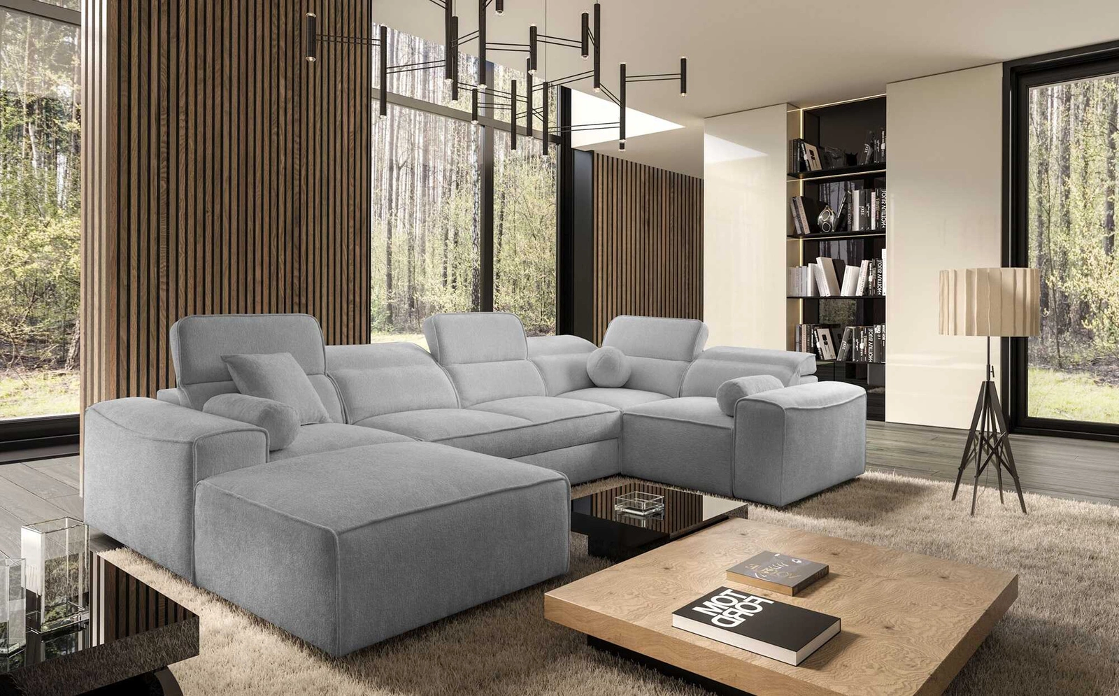 Rohová sedací souprava s funkcí spaní Viano IV světle šedá designová levotočivá rohová sedací souprava, která se skvěle hodí do moderních interiérů