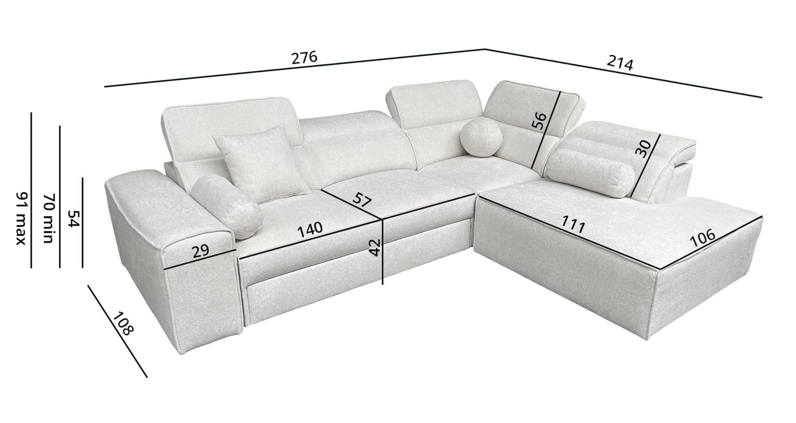 Rozměry nábytku umožňují plánování prostoru v prostorném obývacím pokoji nebo zasedací místnosti. Šířka rohu 276 cm, výška 91 cm a hloubka 214 cm. Spací plocha rohové jednotky je 127x198 cm. Výška sedadla nábytku je 42 cm a výška opěradla je 56 cm. Vlnité pružiny a polyuretanová pěna T30 je materiál, z něhož je vyrobeno sedadlo rohu. Pevné opěradlo s nastavitelnými opěrkami hlavy umožní snadné adaptace úhel opěrek hlavy podle vašich preferencí a zaručí vám pohodlný odpočinek po dlouhém dni, který oceníte vy, vaši blízcí i hosté, kteří si na tuto jedinečnou rohovou pohovku sednou.