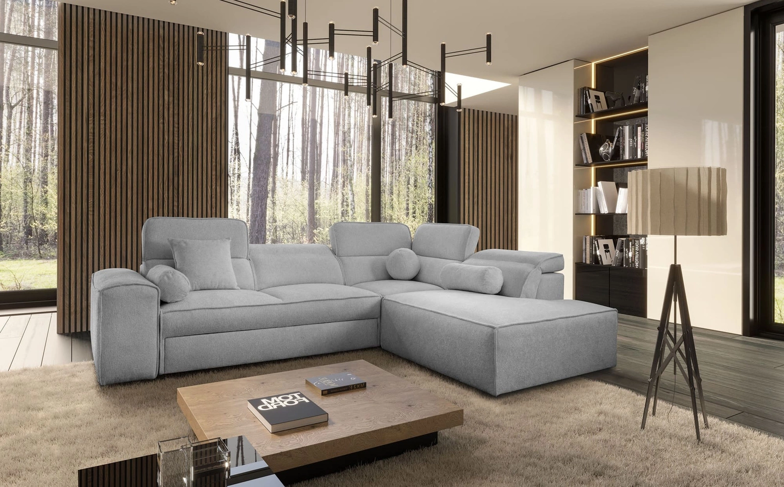 Rohová sedací souprava s funkcí spaní Viano VII světle šedá pravá moderní a stylová rohová sedací souprava s nastavitelnými opěrkami hlavy dekorativními polštáři