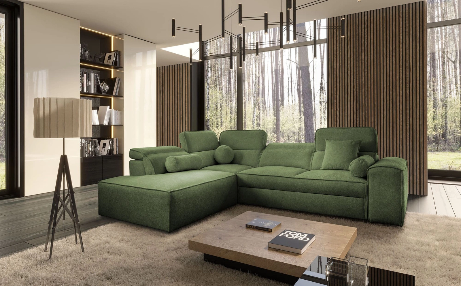 Rohová sedací souprava s funkcí spaní Viano VII zelená levá módní a stylová rohová sedací souprava s nastavitelnými opěrkami hlavy dekorativními polštáři