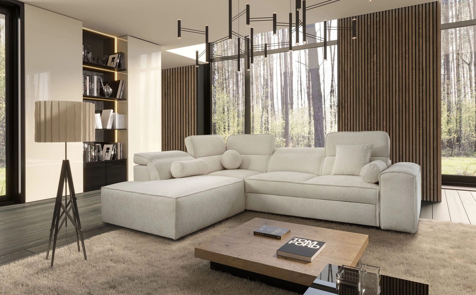 Rohová sedací souprava s funkcí spaní Viano VII krémová levá Módní a stylová rohová sedací souprava s nastavitelnými opěrkami hlavy Dekorativní polštáře