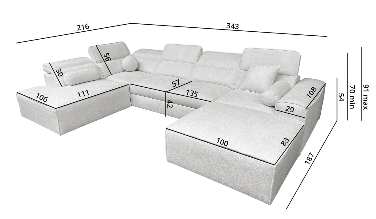 Rozměry nábytku umožňují plánování prostoru v prostorném obývacím pokoji nebo zasedací místnosti. Šířka rohu 343 cm, výška 91 cm a hloubka 216 cm. Spací plocha rohové jednotky je 127x268 cm. Výška sedadla nábytku je 42 cm a výška opěradla je 56 cm. Vlnité pružiny a polyuretanová pěna T30 je materiál, z něhož je vyrobeno sedadlo rohu. Pevné opěradlo s nastavitelnými opěrkami hlavy umožní snadné adaptace úhel opěrek hlavy podle vašich preferencí a zaručí vám pohodlný odpočinek po dlouhém dni, který oceníte vy, vaši blízcí i hosté, kteří si na tuto jedinečnou rohovou pohovku sednou.