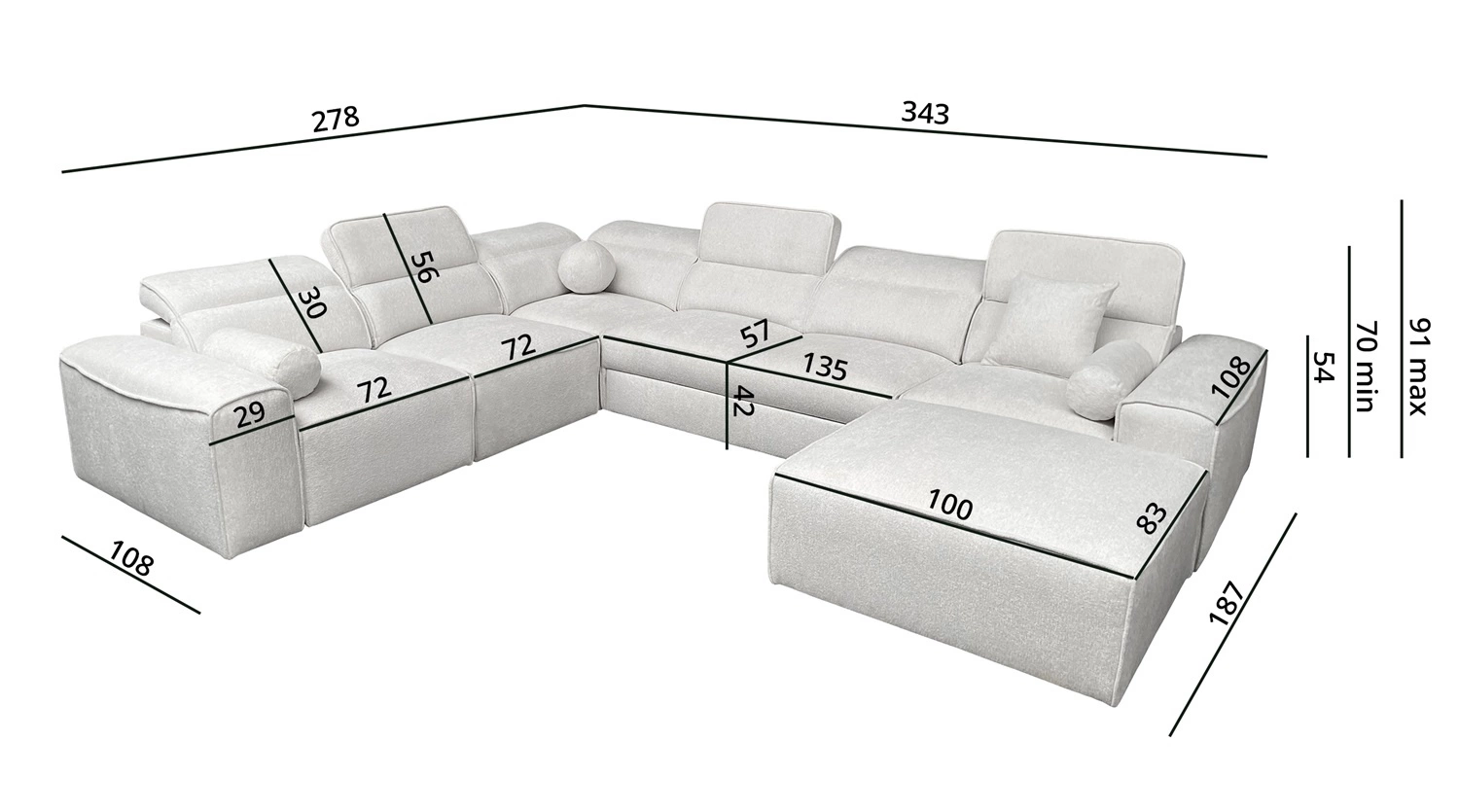 Rozměry nábytku umožňují plánování prostoru v prostorném obývacím pokoji nebo zasedací místnosti. Šířka rohu 343 cm, výška 91 cm a hloubka 278 cm. Spací plocha rohové jednotky je 127x268 cm. Výška sedadla nábytku je 42 cm a výška opěradla je 56 cm. Vlnité pružiny a polyuretanová pěna T30 je materiál, z něhož je vyrobeno sedadlo rohu. Pevné opěradlo s nastavitelnými opěrkami hlavy umožní snadné adaptace úhel opěrek hlavy podle vašich preferencí a zaručí vám pohodlný odpočinek po dlouhém dni, který oceníte vy, vaši blízcí i hosté, kteří si na tuto jedinečnou rohovou pohovku sednou.