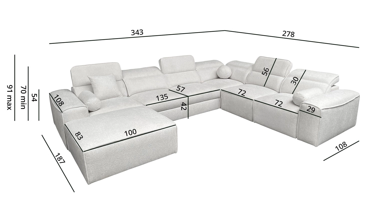 Rozměry nábytku umožňují plánování prostoru v prostorném obývacím pokoji nebo zasedací místnosti. Šířka rohu 343 cm, výška 91 cm a hloubka 278 cm. Spací plocha rohové jednotky je 127x268 cm. Výška sedadla nábytku je 42 cm a výška opěradla je 56 cm. Vlnité pružiny a polyuretanová pěna T30 je materiál, z něhož je vyrobeno sedadlo rohu. Pevné opěradlo s nastavitelnými opěrkami hlavy umožní snadné adaptace úhel opěrek hlavy podle vašich preferencí a zaručí vám pohodlný odpočinek po dlouhém dni, který oceníte vy, vaši blízcí i hosté, kteří si na tuto jedinečnou rohovou pohovku sednou.