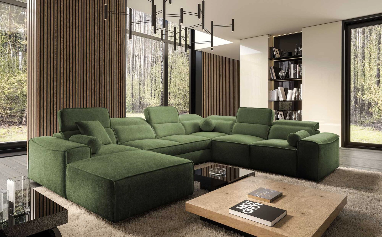 Rohová sedací souprava s funkcí spaní Viano VIII zelená levá moderní rohová sedací souprava se zajímavým designem kontejnerů na lůžkoviny
