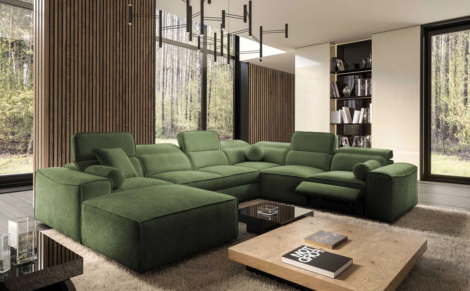 Rohová sedací souprava Viano VIII Lux v zelené barvě s výsuvnou podnožkou je zajímavě vypadající kus nábytku s elegantní povrchovou úpravou.