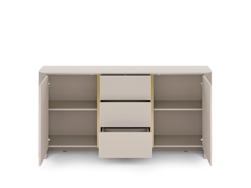 - Komoda Bari se vyznačuje moderním designem, který spojuje eleganci s funkčností. Zaoblené hrany dodávají nábytku harmonii a díky vysokým nohám působí velmi lehce. Zlaté lemování přepážky dodává jedinečný styl.