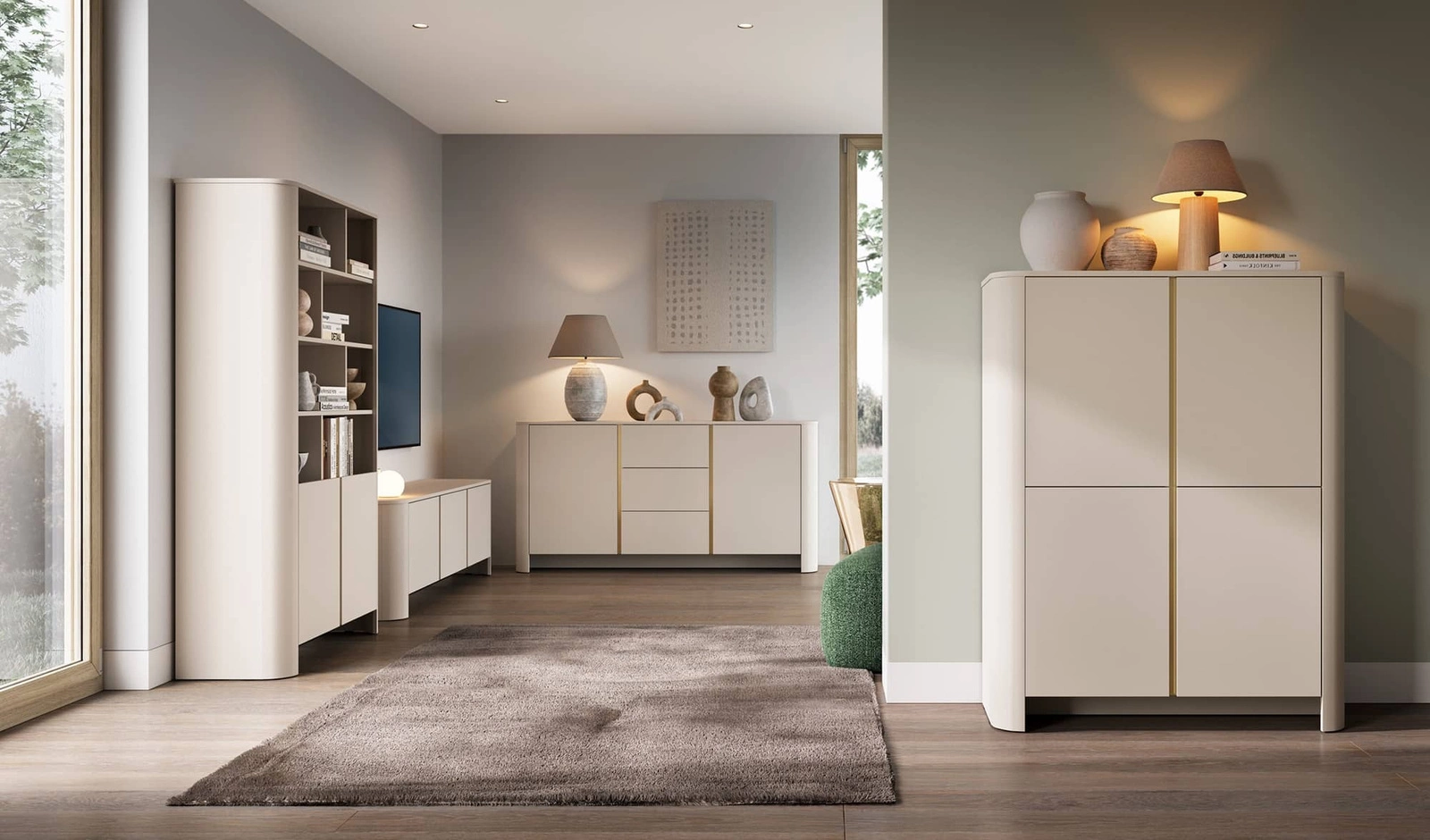 Komoda Bari je nejen funkčním kusem nábytku, ale také elegantním prvkem interiérového designu. Jedinečné, zaoblené hrany komody a čelo s hladkým povrchem vnášejí do místnosti harmonii a zároveň dodávají celé stavbě velmi módní vzhled. Neobvyklé pkombinace béžová v kašmírovém odstínu se zlatým lemováním na přepážce vytváří stylový kontrast. Vysoká základna tje nejen stylovým doplňkem, ale také velmi praktickým doplňkem komody Bari. Tato designová komoda se stane ústředním bodem obývacího pokoje, upoutá pozornost a podtrhne styl uspořádání.
