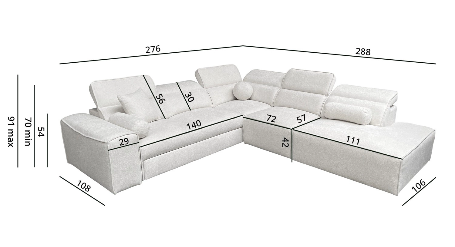 Rozměry nábytku umožňují plánování prostoru v prostorném obývacím pokoji nebo zasedací místnosti. Šířka rohu 276 cm, výška 91 cm a hloubka 288 cm. Spací plocha rohové jednotky je 127x198 cm. Výška sedadla nábytku je 42 cm a výška opěradla je 56 cm. Vlnité pružiny a polyuretanová pěna T30 je materiál, z něhož je vyrobeno sedadlo rohu. Pevné opěradlo s nastavitelnými opěrkami hlavy umožní snadné adaptace úhel opěrek hlavy podle vašich preferencí a zaručí vám pohodlný odpočinek po dlouhém dni, který oceníte vy, vaši blízcí i hosté, kteří si na tuto jedinečnou rohovou pohovku sednou.