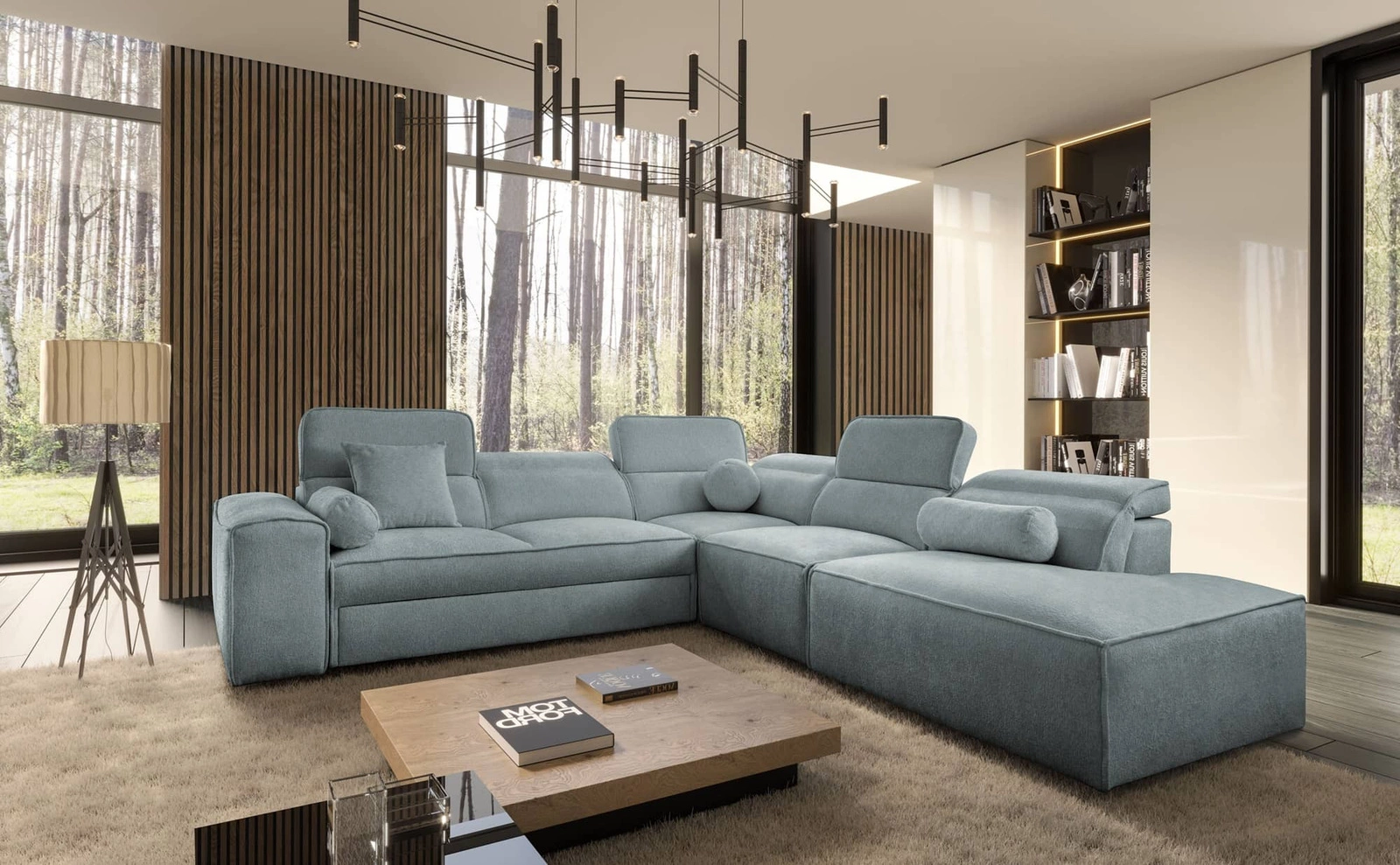 Rohová pohovka Viano IX v šedomodré barvě je zajímavě vypadající kus nábytku s elegantní povrchovou úpravou.