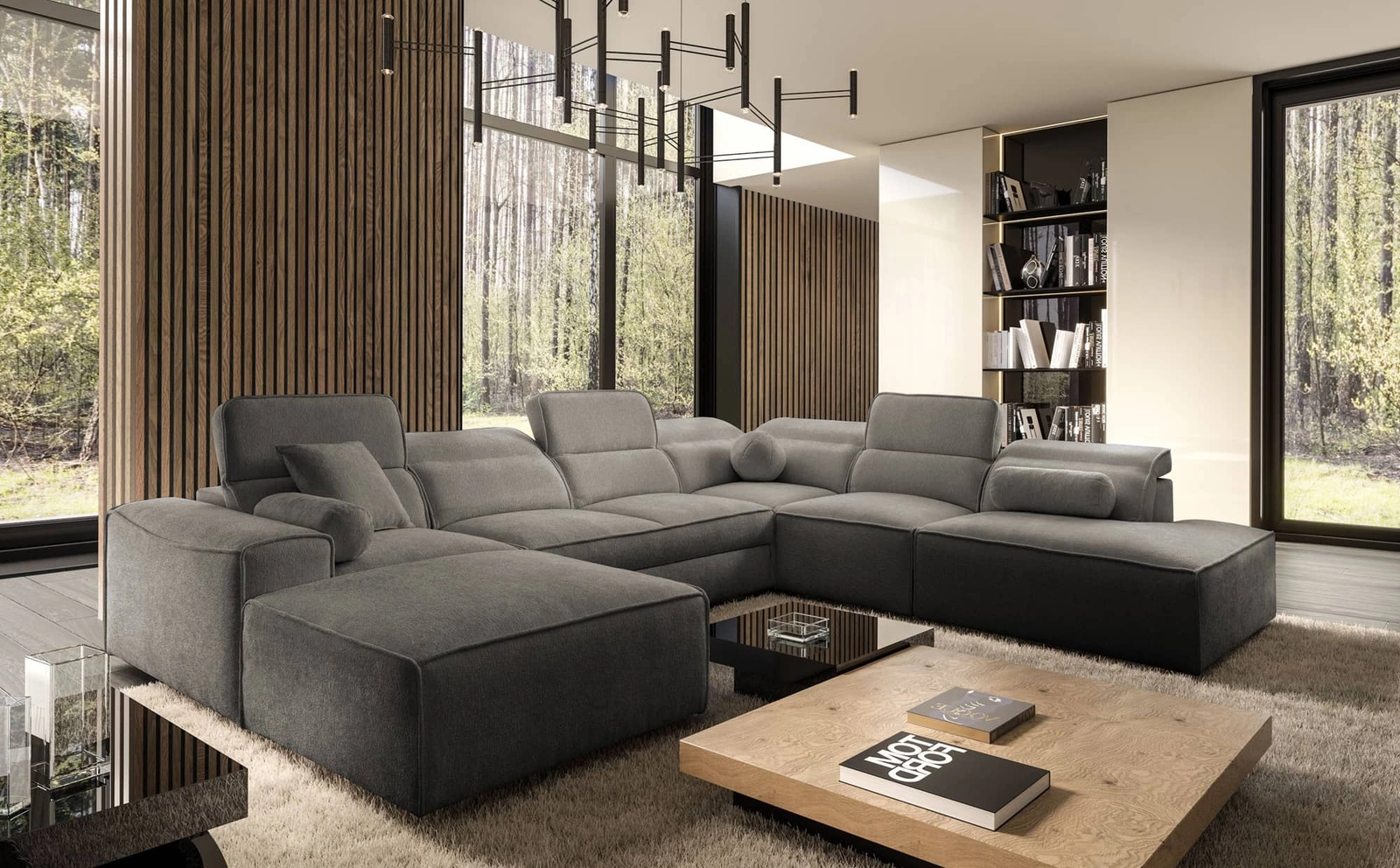 Rohová sedací souprava s funkcí spaní Viano X šedá levé provedení Rohová sedací souprava do obývacího pokoje v moderním stylu s nastavitelnými opěrkami hlavy