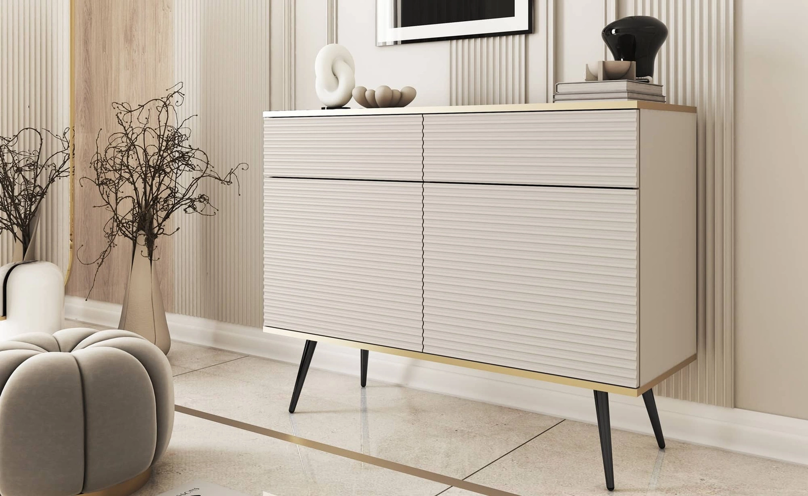 Luxusní 107 cm zásuvková komoda béžové barvy stylová komoda s drážkovanými čely korpus zakončený zlatým lemováním černé kovové nohy