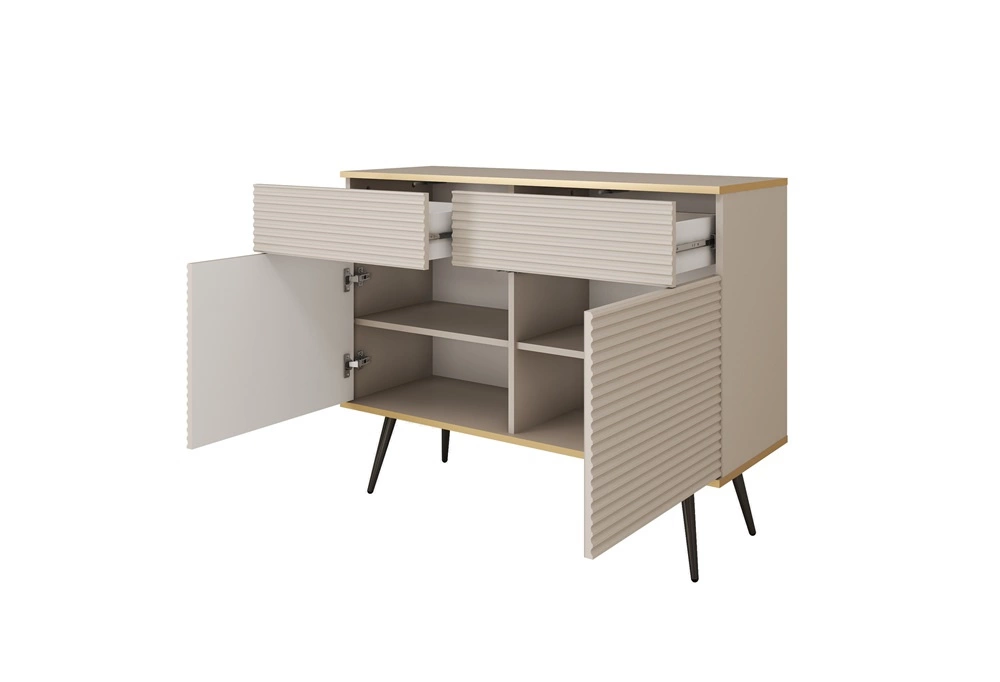 Komoda z kolekce Luxury potěší všechny milovníky sofistikovaného uspořádání. Nábytek se vyznačuje jednoduchostí a elegancí a překvapuje širokou funkčností. Ikonická béžová barva v teplém odstínu, který rozzáří místnost a dodá jí jedinečný vzhled. Zajímavá kombinace drážkovaná čela slamelový plech obklopující rám komody je neobvyklou povrchovou úpravou nábytku. Kovové nohy v kontrastních černá barva dodávají vizuální lehkost při zachování funkčnosti.