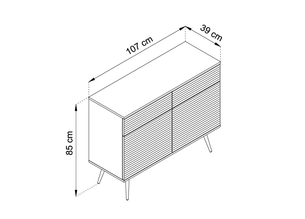 Přítomnost komody se stane stylovou tečkou na závěr místnosti a dodá jí zvláštní charakter. Jednoduchý tvar nábytku dokonale ladí s minimalistickým designem. Korpus komody do obývacího pokoje je z vysoce kvalitní laminované desky, která je vysoce odolná vůči vnějším vlivům. Stylové rýhovaná čela z odolného materiálu mDF desky. Dvířka a zásuvky komody se otevírají pomocí tlačítka bezúchytkového systému push-to-open. Luxusní komoda do obývacího pokoje je vizuálně atraktivní a funkční.