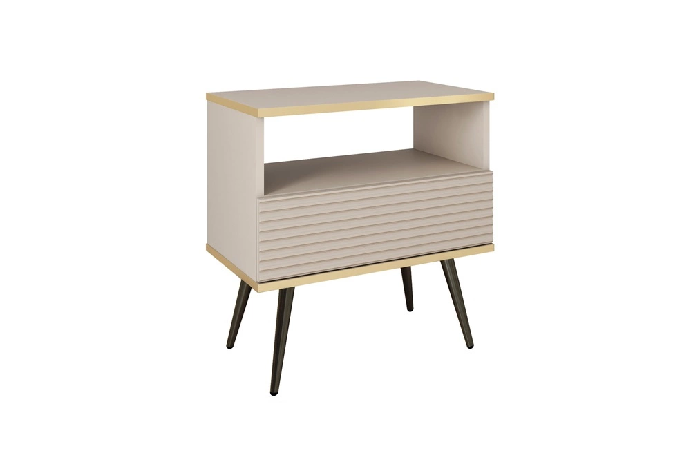 Luxusní béžový noční stolek se zásuvkou elegantní design skříňka se zlatým lemováním skříňka s rýhovaným čelem černé vysoké nohy