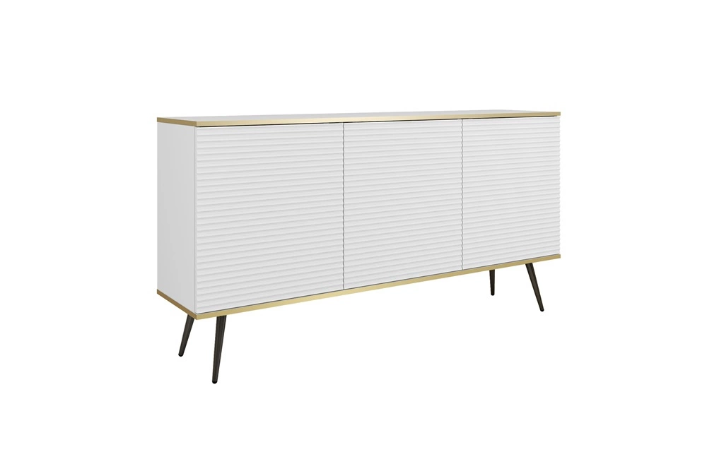 Luxusní komoda 160 cm bílá elegantní design stylová drážkovaná čela korpus komody doplněný zlatým lemováním černé kovové nohy