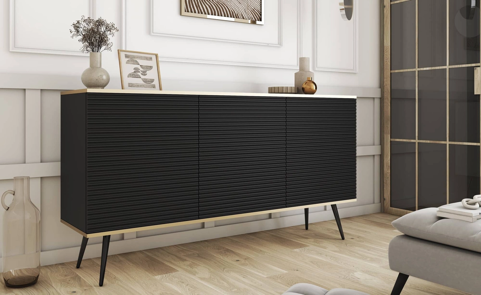 Luxusní komoda 160 cm černá elegantní design stylová drážkovaná čela korpus komody doplněný zlatým lemováním černé kovové nohy
