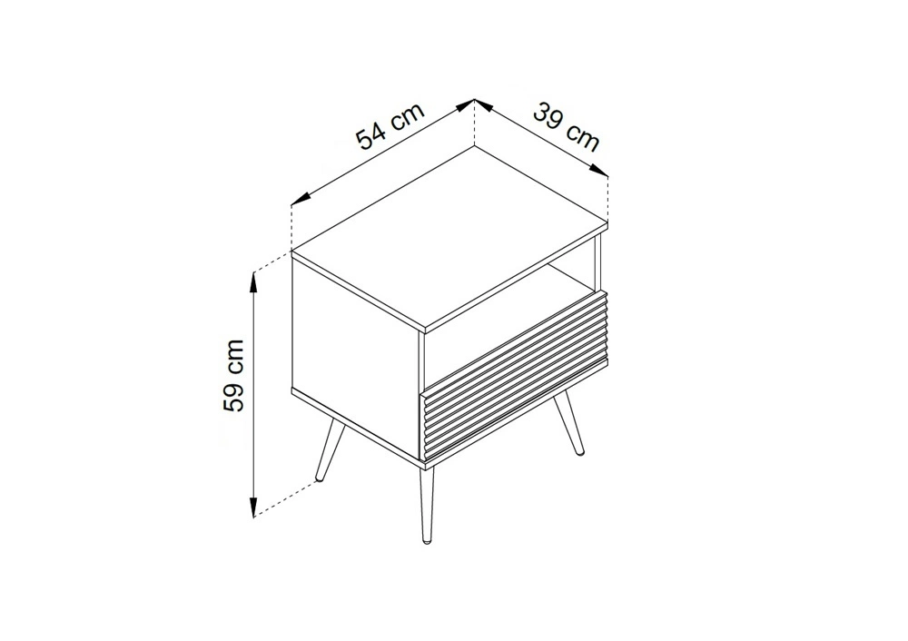 Přítomnost skříně se stane stylovým doplňkem každé ložnice a dodá jí zvláštní charakter. Jednoduchý tvar nábytku dokonale ladí s minimalistickým designem. Korpus skříně do ložnice je vyrobeno z vysoce kvalitní laminované desky, která je vysoce odolná vůči vnějším vlivům. Stylové rýhovaná čela z odolného materiálu mDF desky. Zásuvka noční skříňky se otevírá pomocí bezúchytkový systém otevírání push to open. Luxusní noční stolek do ložnice je vizuálně přitažlivý i funkční.
