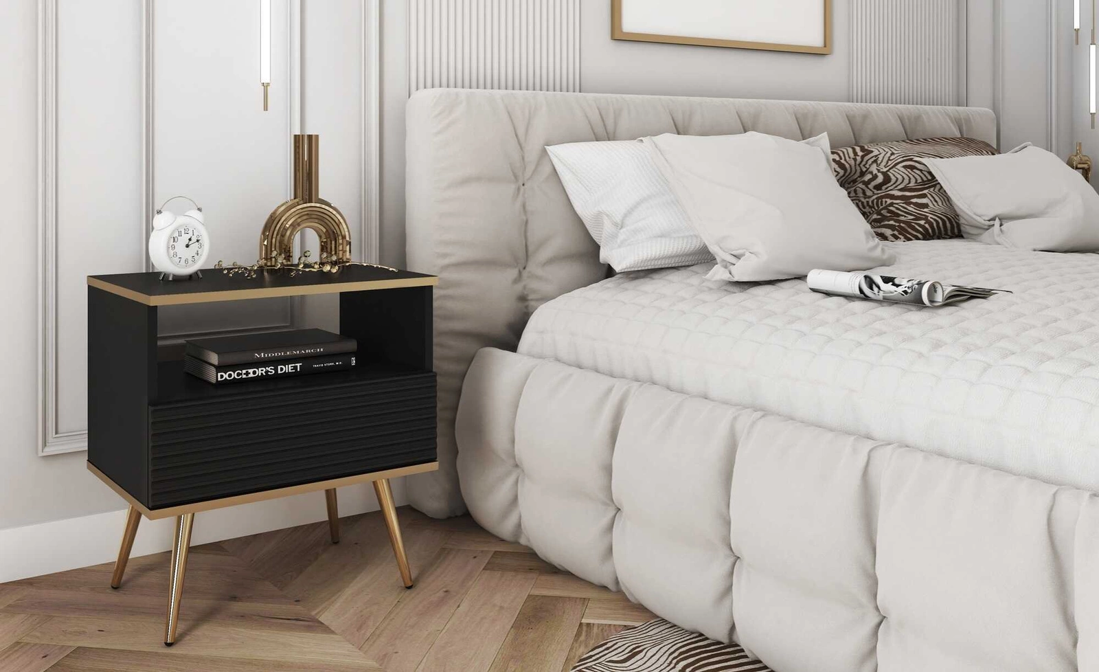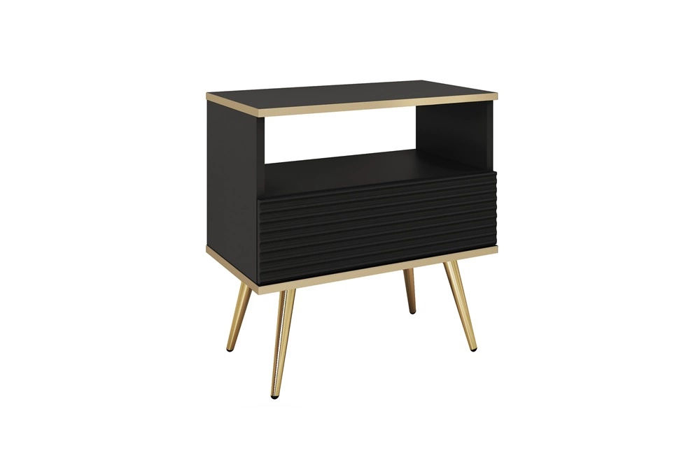 Luxusní noční stolek se zásuvkou černý elegantní design skříňka doplněná zlatým lemováním skříňka s rýhovaným čelem zlaté vysoké nohy