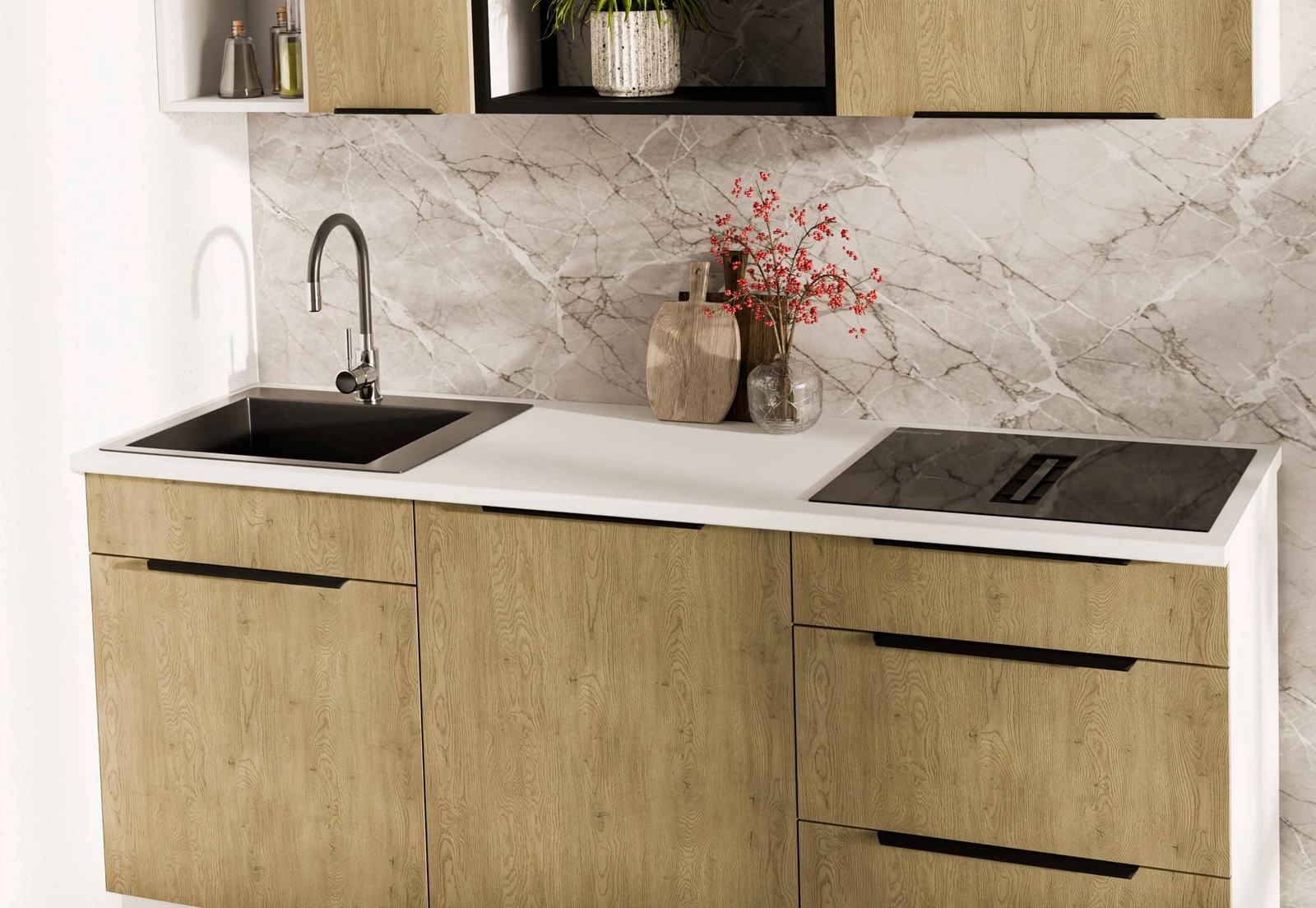 Sada kuchyňského nábytku Cremona 180 cm elegantní kuchyňské skříňky v jemných a přírodních barvách ideální sada do malé kuchyně