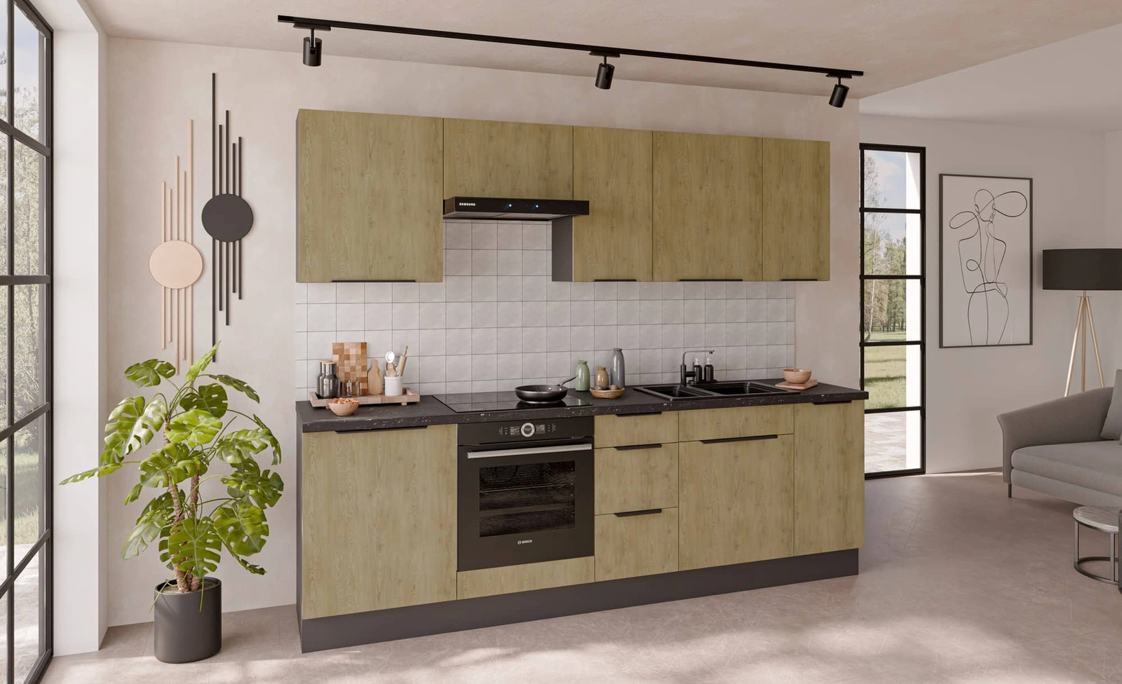 Sada kuchyňského nábytku Corsico 260 cm elegantní kuchyňské skříňky v moderních a přírodních barvách úchyty s kovovými hranami