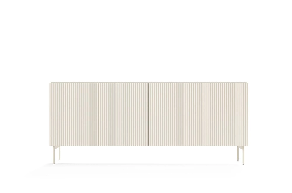 Komoda z kolekce Muti je moderní kus nábytku s jednoduchým, ale originálním stylem. Jemná béžová barva v kašmírovém odstínu promění váš domov v oázu elegance, svěžesti a harmonie. Charakteristickým rysem kolekce nábytku Muti jsou poutavé rýhování na čelech a korpusech, díky čemuž kolekce dokonale zapadá do současných trendů interiérového designu. Celá stránka doplněk kov, béžové nohy zdůraznění elegantního designu komody. Jedinečný design komody splní očekávání milovníků odvážných i sofistikovaných aranžmá.