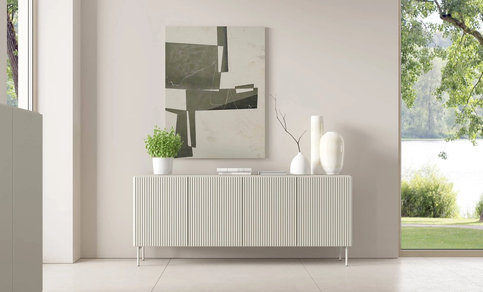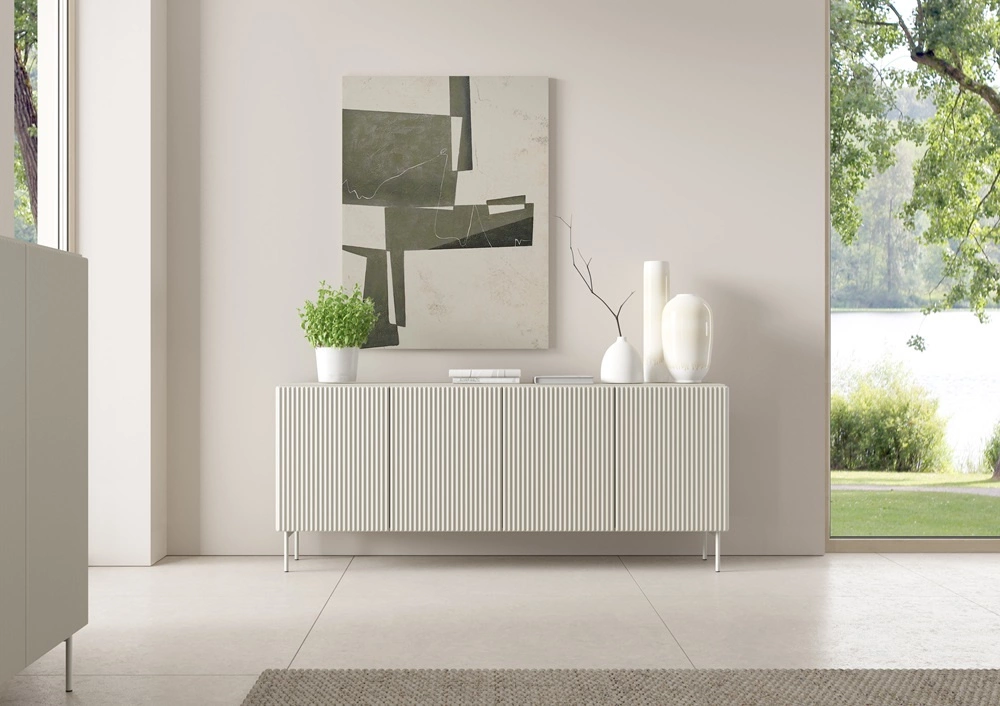Drážkovaná komoda byly vyrobeny z mDF o tloušťce 18 mm, který je odolný vůči vnějším vlivům, jako jsou otlaky, nárazy a nešťastné škrábance. Jemný kašmír lze dokonale začlenit do módního nábytku, takže komoda Muti je ideální volbou jako komoda do obývacího pokoje s originální povrchovou úpravou, jako komoda do obývacího pokoje nebo jako komoda do ložnice v moderním stylu. Komodu lze s úspěchem použít i jako kancelářský nábytek.