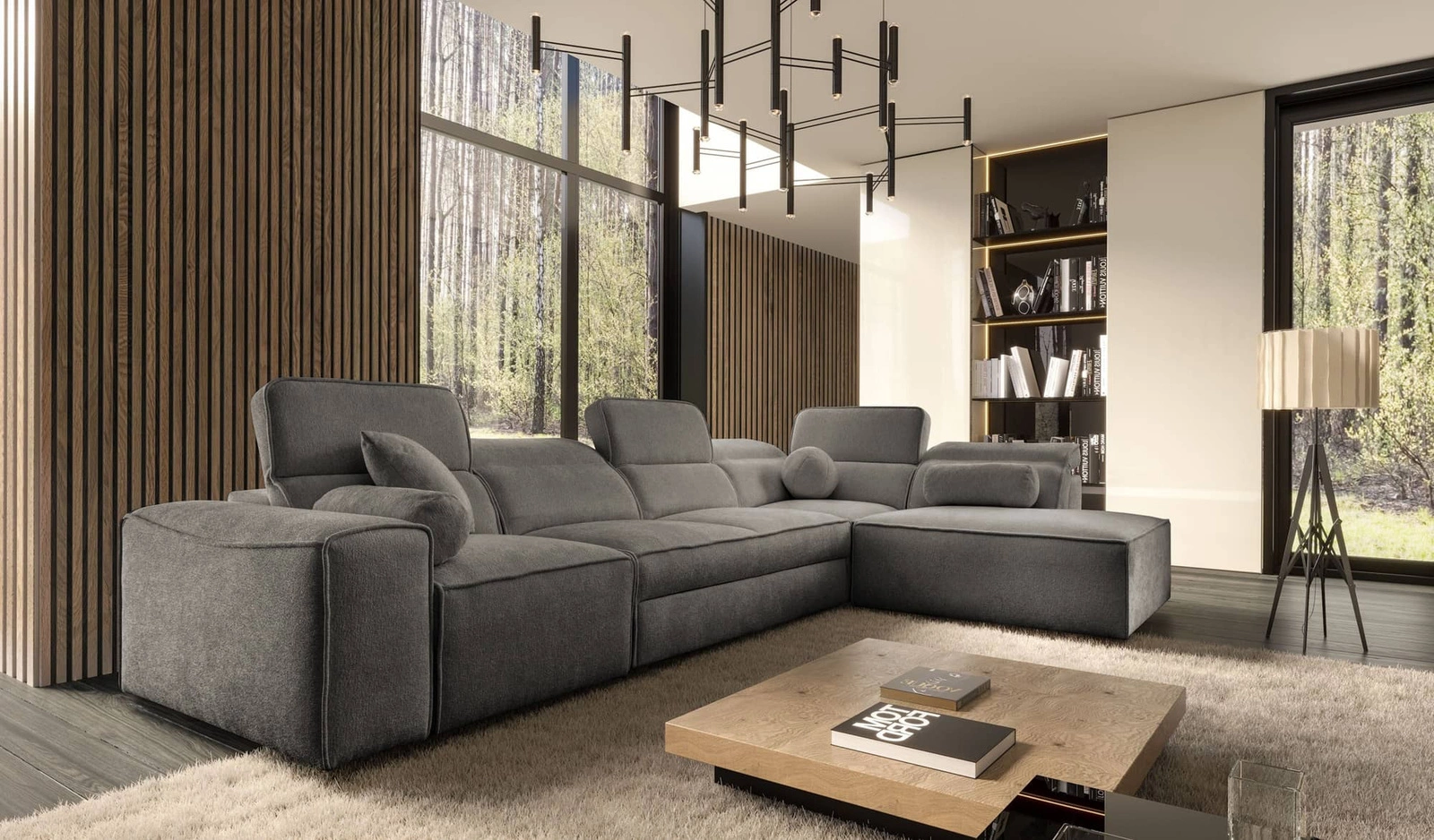 Rohová sedací souprava s funkcí spaní Viano XI šedá pravá strana Módní a stylová rohová sedací souprava s nastavitelnými opěrkami hlavy Dekorativní polštáře