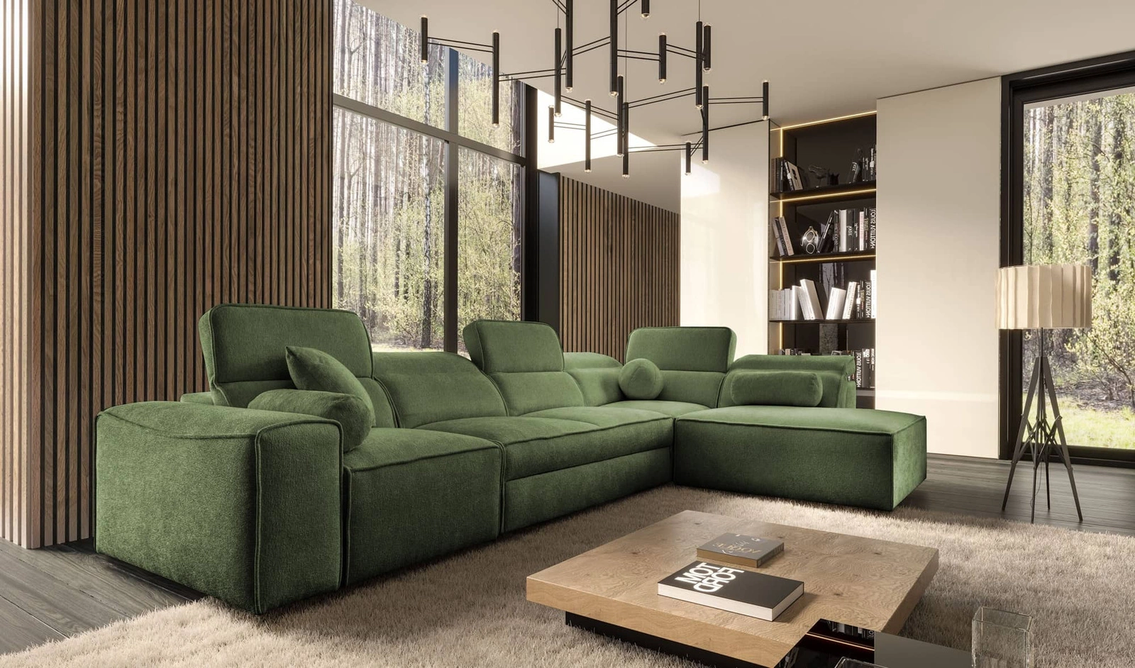 Rohová sedací souprava s funkcí spaní Viano XI zelená pravý roh trendy a stylová s nastavitelnými opěrkami hlavy dekorativní polštáře