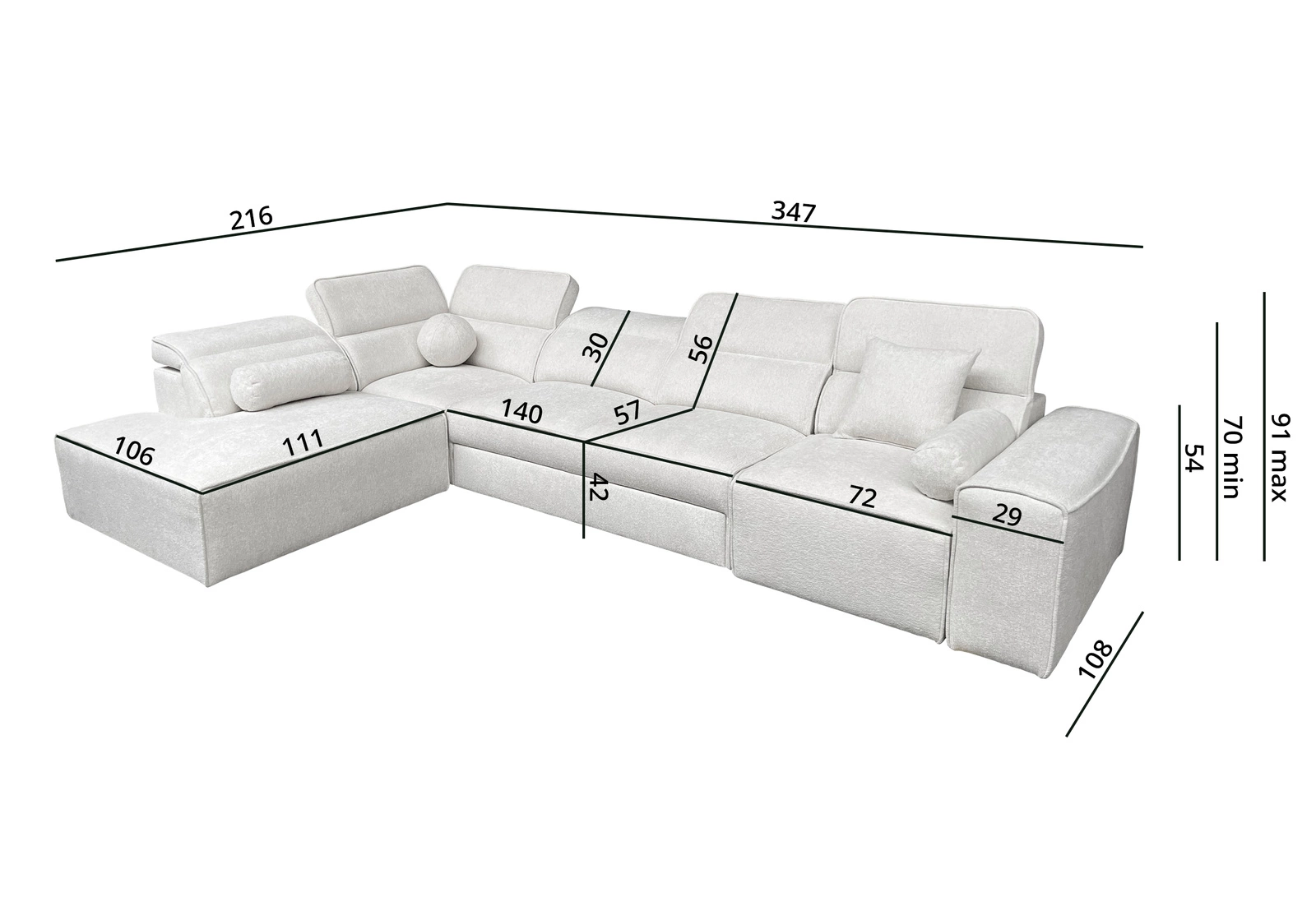 Rozměry nábytku umožňují plánování prostoru v prostorném obývacím pokoji nebo zasedací místnosti. Šířka rohu 347 cm, výška 91 cm a hloubka 216 cm. Spací plocha rohové jednotky je 127x198 cm. Výška sedadla nábytku je 42 cm a výška opěradla je 56 cm. Vlnité pružiny a polyuretanová pěna T30 je materiál, z něhož je vyrobeno sedadlo rohu. Pevné opěradlo s nastavitelnými opěrkami hlavy umožní snadné adaptace úhel opěrek hlavy podle vašich preferencí a zaručí vám pohodlný odpočinek po dlouhém dni, který oceníte vy, vaši blízcí i hosté, kteří si na tuto jedinečnou rohovou pohovku sednou.