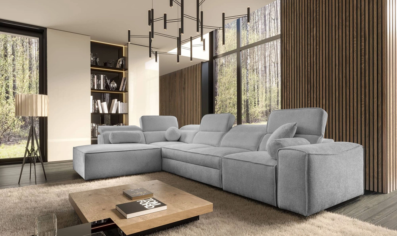Rohová sedací souprava s funkcí spaní Viano XI světle šedá levá módní a stylová rohová sedací souprava s nastavitelnými opěrkami hlavy dekorativní polštáře