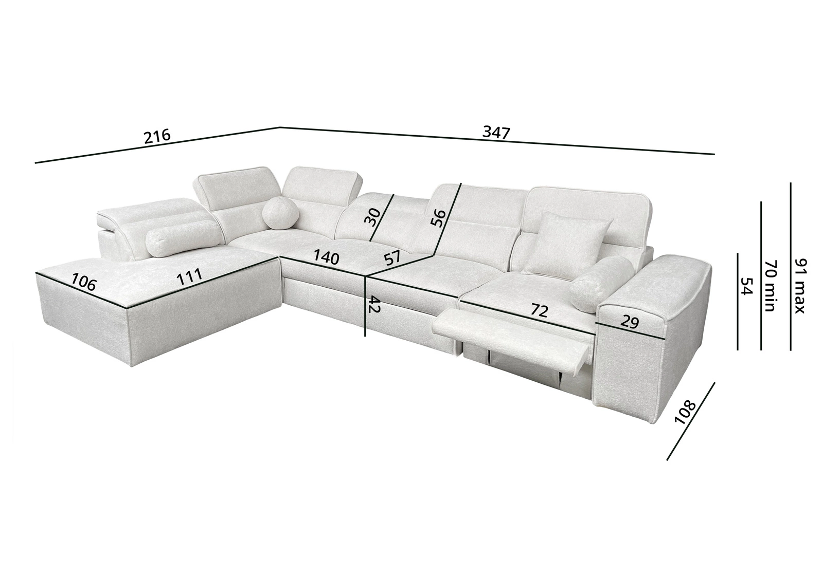 Rozměry nábytku umožňují plánování prostoru v prostorném obývacím pokoji nebo zasedací místnosti. Šířka rohu 347 cm, výška 91 cm a hloubka 216 cm. Spací plocha rohové jednotky je 127x198 cm. Výška sedadla nábytku je 42 cm a výška opěradla je 56 cm. Vlnité pružiny a polyuretanová pěna T30 je materiál, z něhož je vyrobeno sedadlo rohu. Pevné opěradlo s nastavitelnými opěrkami hlavy umožní snadné adaptace úhel opěrek hlavy podle vašich preferencí a zaručí vám pohodlný odpočinek po dlouhém dni, který oceníte vy, vaši blízcí i hosté, kteří si na tuto jedinečnou rohovou pohovku sednou.