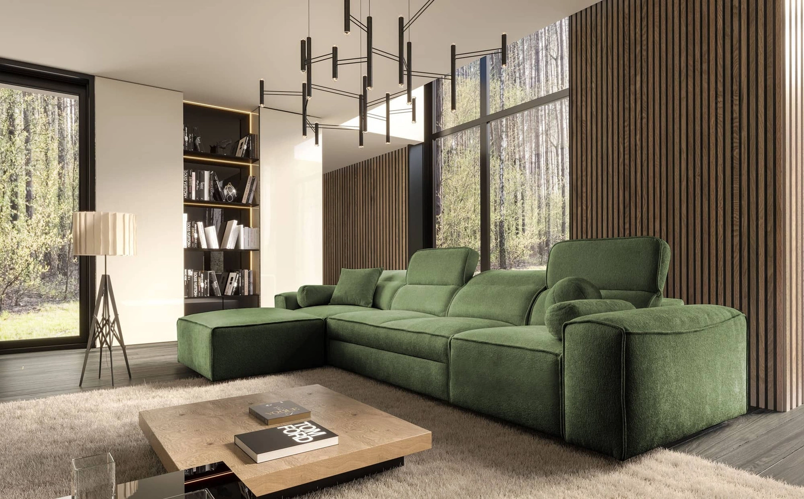 Rohová sedací souprava s funkcí spaní Viano XII zelená levá strana stylová rohová sedací souprava se zajímavým tvarem nastavitelné opěrky hlavy dekorativní polštáře