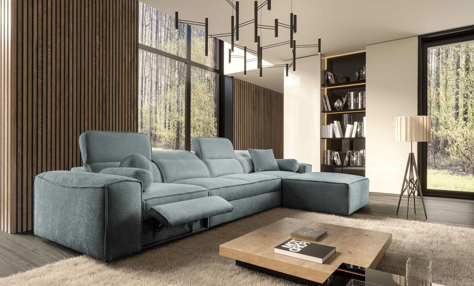 Rohová sedací souprava Viano XII Lux v šedomodré barvě s výsuvnou podnožkou je zajímavě vypadající kus nábytku s elegantní povrchovou úpravou.