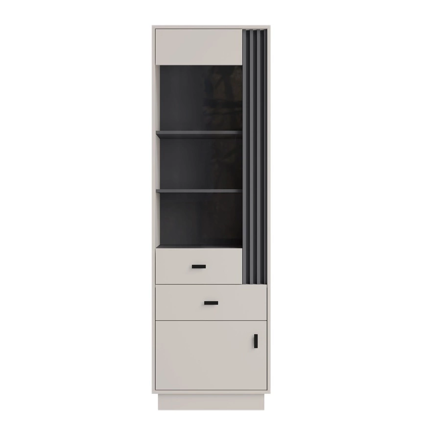 Knihovna z kolekce Estan je ideální volbou pro milovníky moderního uspořádání s elegantním charakterem, pro které jsou rozsáhlé funkčnost nábytek. Fronty v béžová s kašmírovým odstínem jsou rozděleny vložkami v barvě antracitové. Stojan je vyroben z 1 výklopné dveře, tři otevřené sekce a s 2 zásuvky vysouvání na kuličkových ložiscích. Stylovým doplňkem čel knihoven jsou kovové rukojeti v černé barvě.