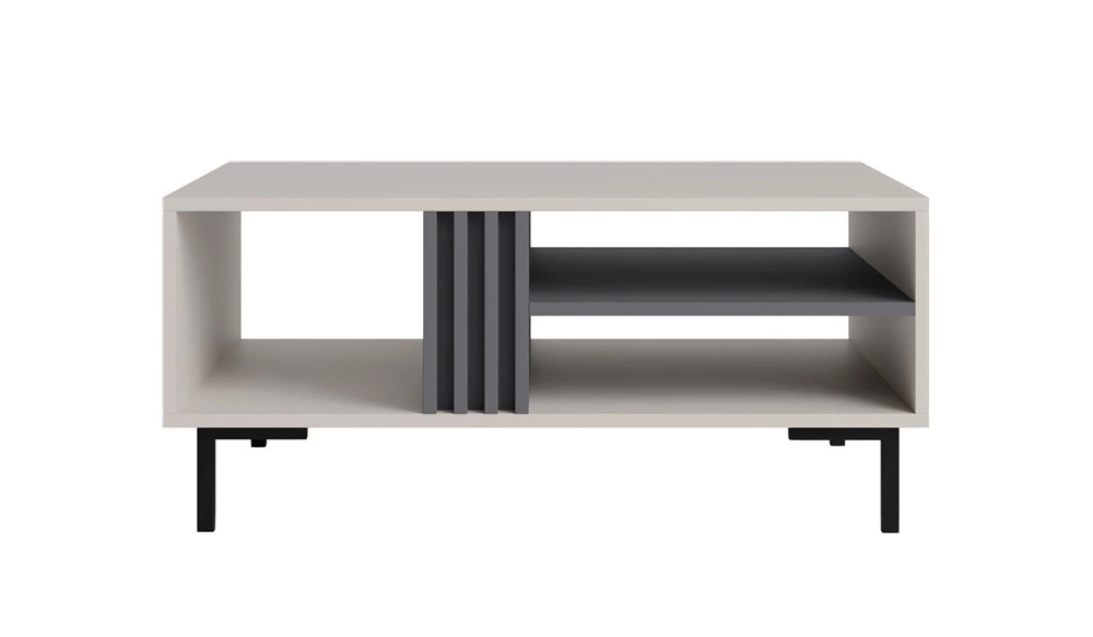 Konferenční stolek Estan je ideální volbou pro milovníky moderního uspořádání s elegantním charakterem, pro které je zároveň důležité, aby měl široký záběr funkčnost nábytek. Fronty v béžová s kašmírovým odstínem jsou rozděleny vložkami v barvě antracitové. Konstrukce nábytku je zesílená kovové nohy i obohacené o stylové ploutve. Deska konferenčního stolku Estan je odolná proti rozlití.