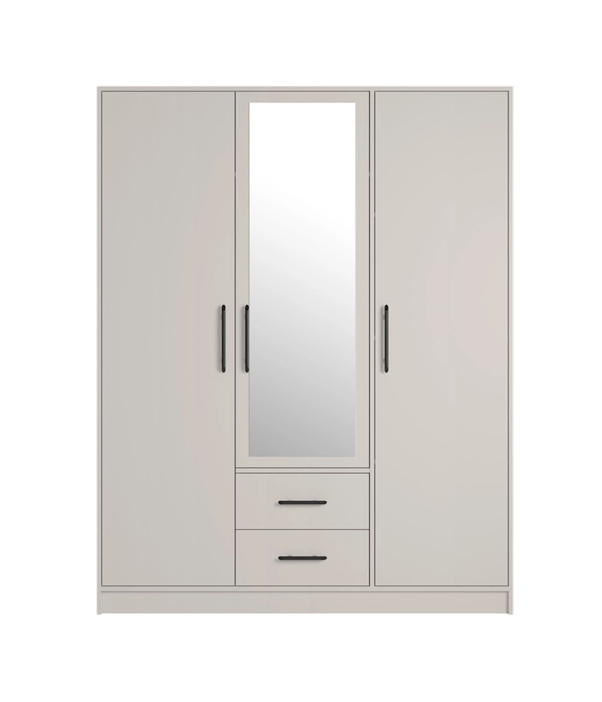 Šatní skříň v béžová s kašmírovým odstínem má adresu výklopné dveře s matným povrchem matný. Nábytek je vyroben z 3 dvířka a 2 zásuvky. Prostřední dveře jsou zakončeny velkým zrcadlo. Čela skříní doplňují hliníkové úchytky. Šatní skříň je vyrobena z vysoce kvalitních z laminované desky, která se vyznačuje tím, že vysokou odolnost proti vnějším vlivům, jako jsou modřiny, nárazy a nešťastné škrábance.