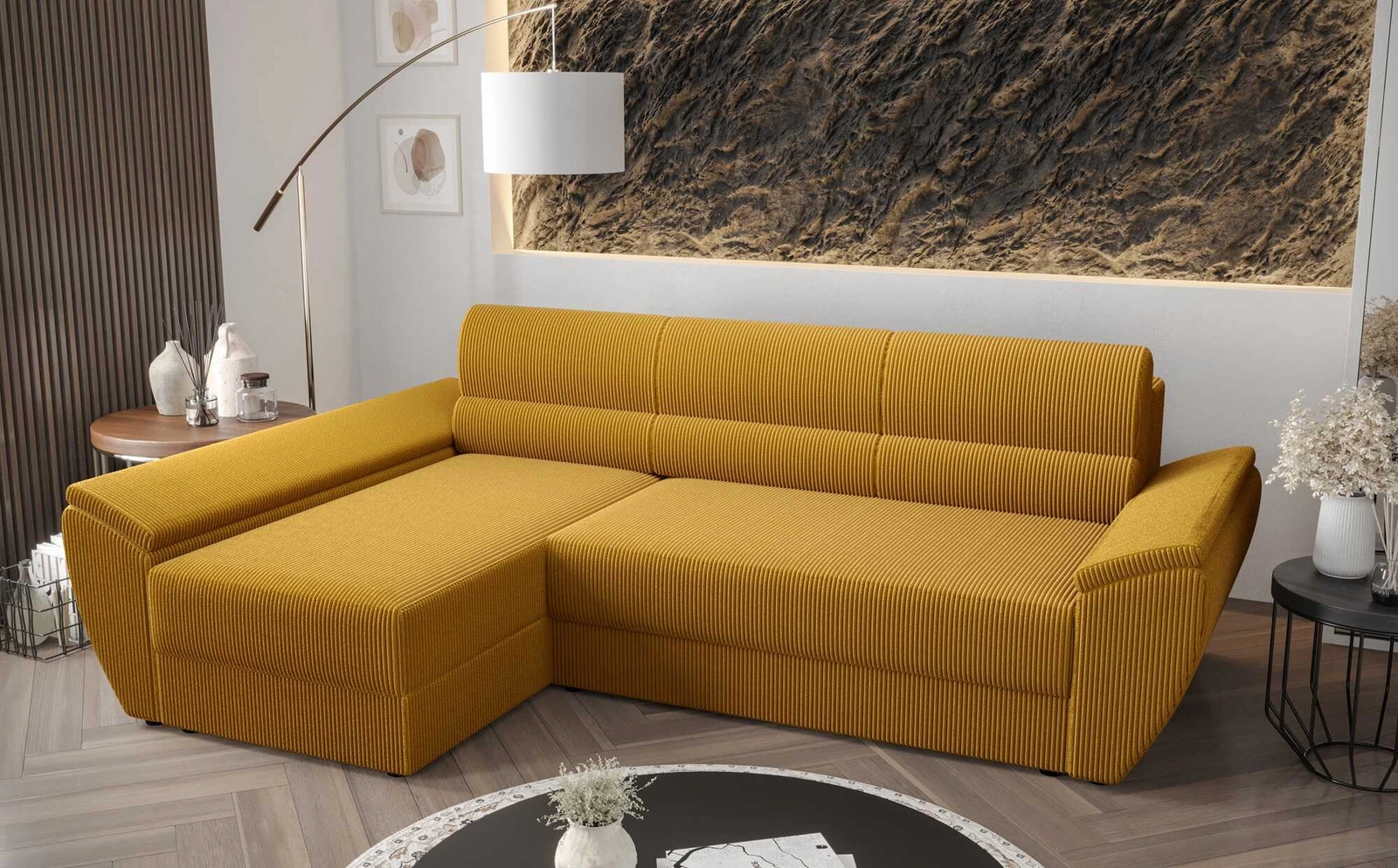 Trojrozměrné manšestrová tkanina s výrazným a silným žebrováním dodává zvláštní charakter a jedinečnou krásu. Tkanina je velmi měkká a přesto pevná a robustní. Čalounická tkanina Poso je odolnost proti oděru, a také snadno se udržuje v čistotě. Díky tomu bude polohovací roh Fogu III vypadat esteticky a elegantně po dlouhou dobu. Rohová sedací souprava s funkcí každodenního spaní je vyrobena z vysoce kvalitních materiálů, které jsou odolné vůči vnějším vlivům, jako je čalounění nábytku a různé druhy nárazů.