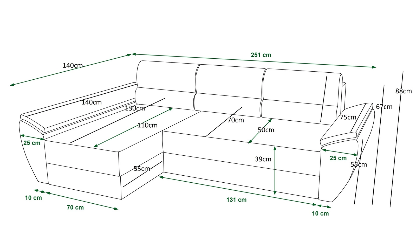 Díky svým rozměrům a široké funkčnosti je rohová pohovka s funkcí spaní ideální jako rohová pohovka do obývacího pokoje nebo jako rozkládací rohová pohovka do pokoje pro hosty. Rohová pohovka s funkcí spaní je také skvělou alternativou k posteli v pokoji pokoj pro mladé. Šířka rohu 251 cm, výška 88 cm a hloubka 140 cm. Spací plocha rohové jednotky je 130x200 cm. Výška sedadla nábytku je 39 cm, a výška opěradla je 47 cm. Polyuretanová pěna T30 je materiál, z něhož je vyrobeno sedadlo rohu. Soft opěrné polštáře zajistí vysokou úroveň pohodlí při každodenním odpočinku, což oceníte vy i vaši hosté, kteří se na tuto jedinečnou rohovou sedačku posadí.