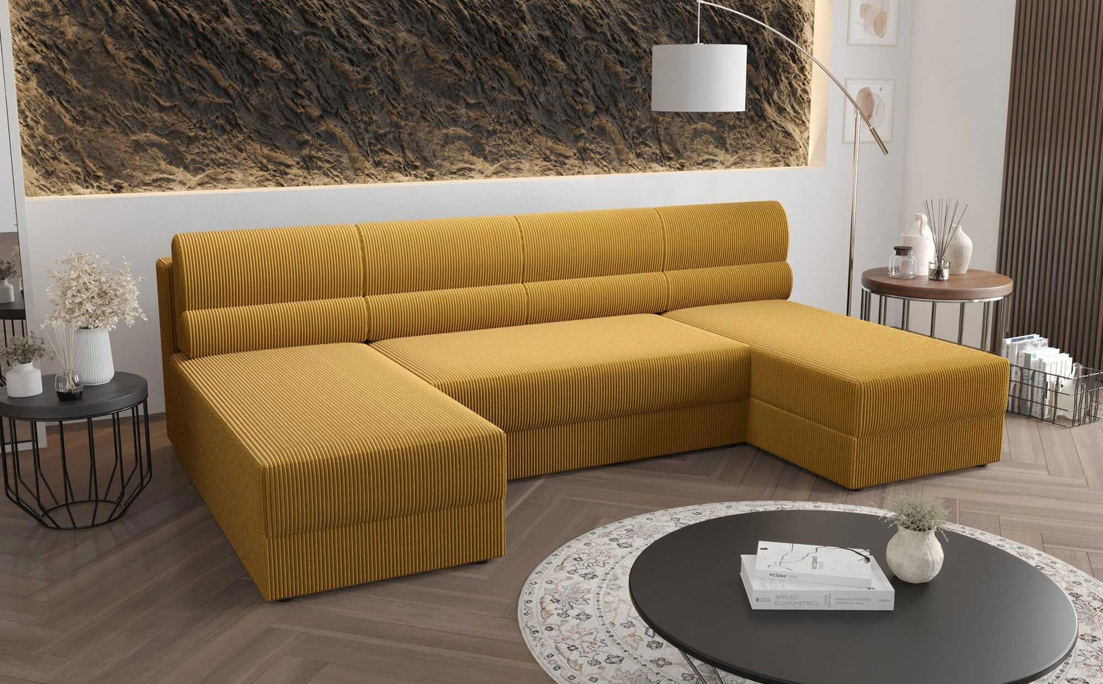 Trojrozměrné manšestrová tkanina s výrazným a silným žebrováním dodává zvláštní charakter a jedinečnou krásu. Tkanina je velmi měkká a přesto pevná a robustní. Čalounická tkanina Poso je odolnost proti oděru, a také snadno se udržuje v čistotě. Díky tomu bude skládací roh Fogu U vypadat esteticky a elegantně po dlouhou dobu. Rohová sedací souprava s funkcí každodenního spaní je vyrobena z vysoce kvalitních materiálů, které jsou odolné vůči vnějším vlivům, jako je čalounění nábytku a různé druhy nárazů.