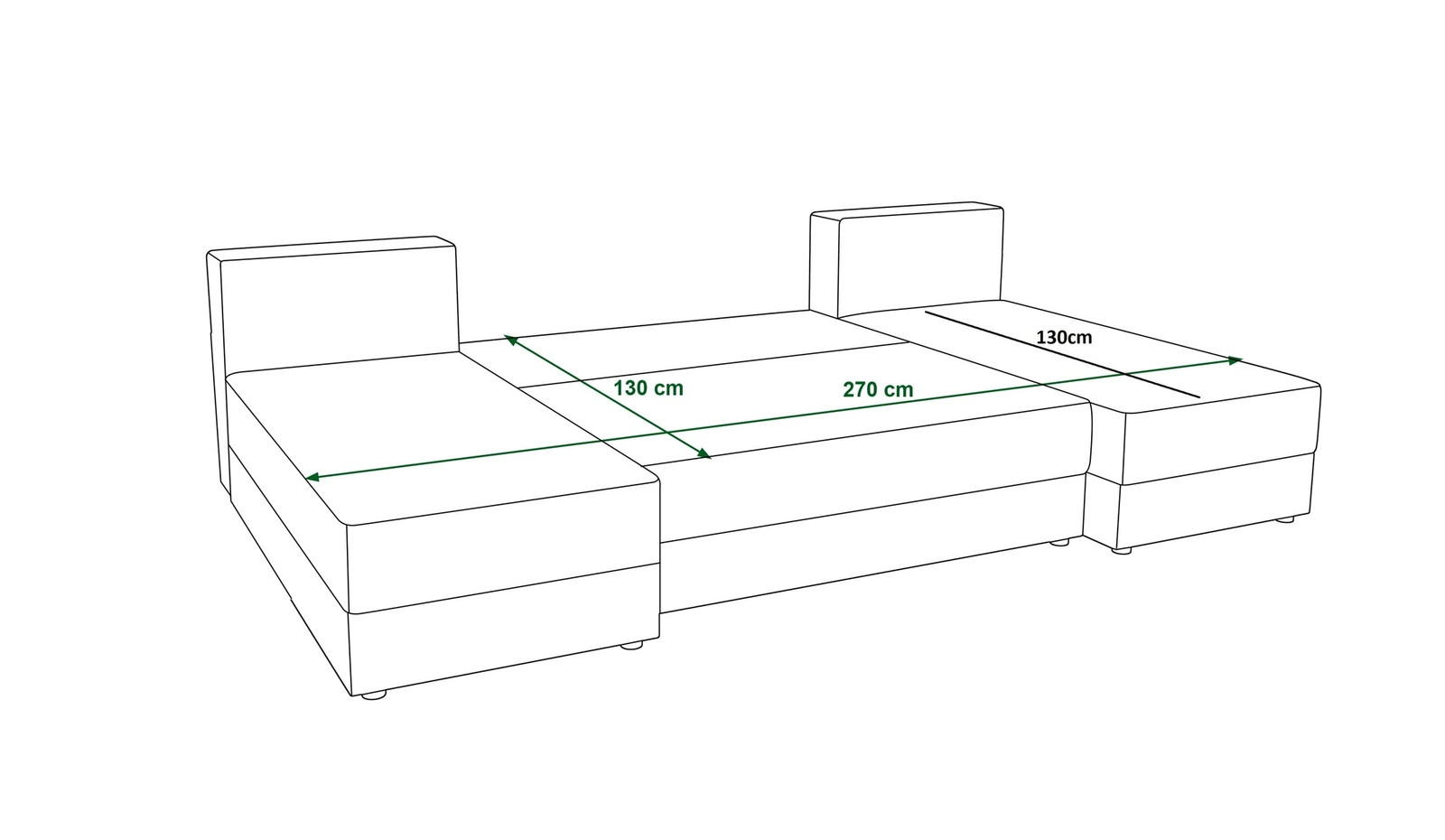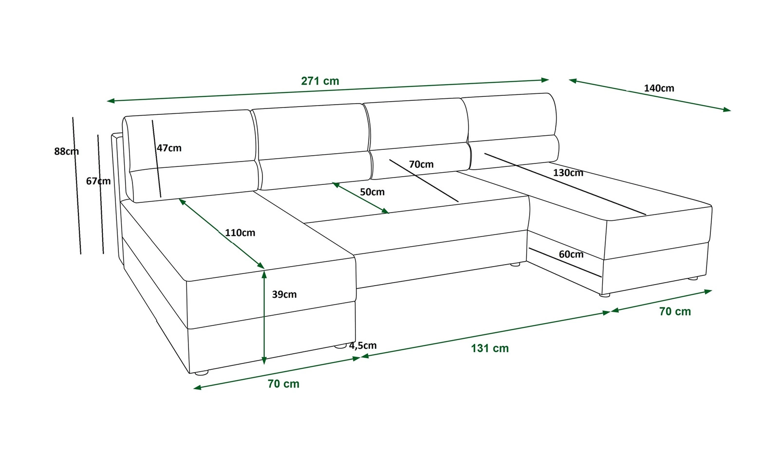 Díky svým rozměrům a široké funkčnosti je rohová pohovka s funkcí spaní ideální jako rohová pohovka do obývacího pokoje nebo jako rozkládací rohová pohovka do pokoje pro hosty. Rohová pohovka s funkcí spaní je také skvělou alternativou k posteli v pokoji pokoj pro mladé. Šířka rohu 271 cm, výška 88 cm a hloubka 140 cm. Spací plocha rohové jednotky je 130x270 cm. Výška sedadla nábytku je 39 cm, a výška opěradla je 47 cm. Polyuretanová pěna T30 je materiál, z něhož je vyrobeno sedadlo rohu. Soft opěrné polštáře zajistí vysokou úroveň pohodlí při každodenním odpočinku, což oceníte vy i vaši hosté, kteří se na tuto jedinečnou rohovou sedačku posadí.