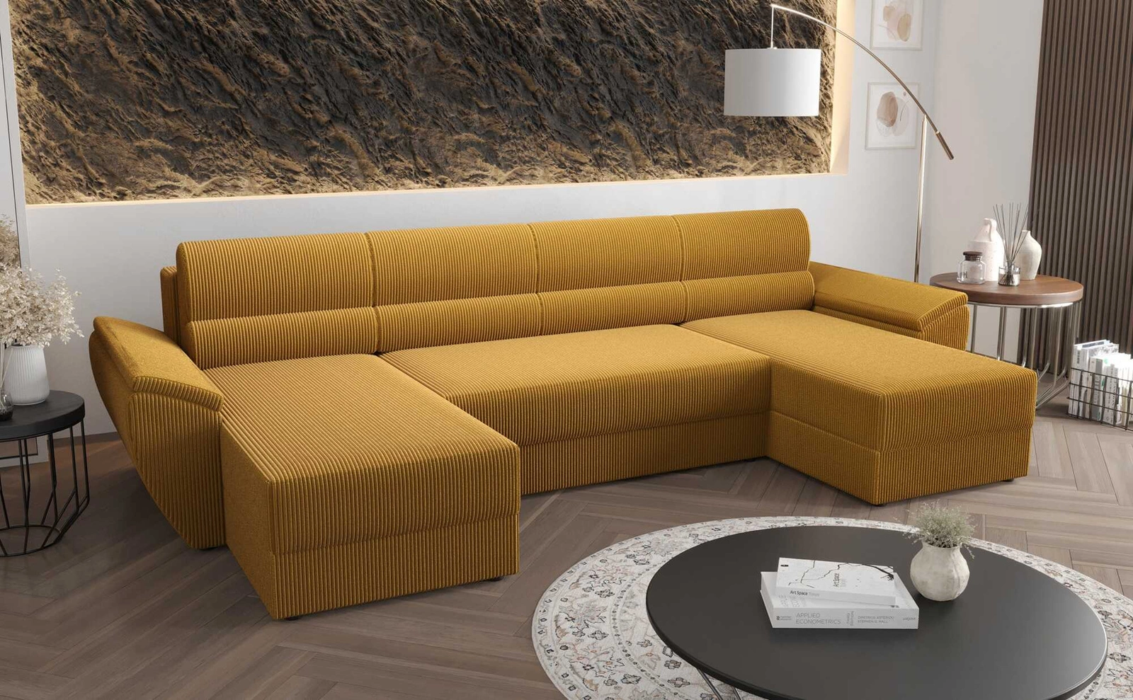 Rohová sedací souprava s funkcí spaní Fogu U II medová pohodlná rohová sedací souprava s pohodlnými područkami zajímavý design kontejner na lůžkoviny
