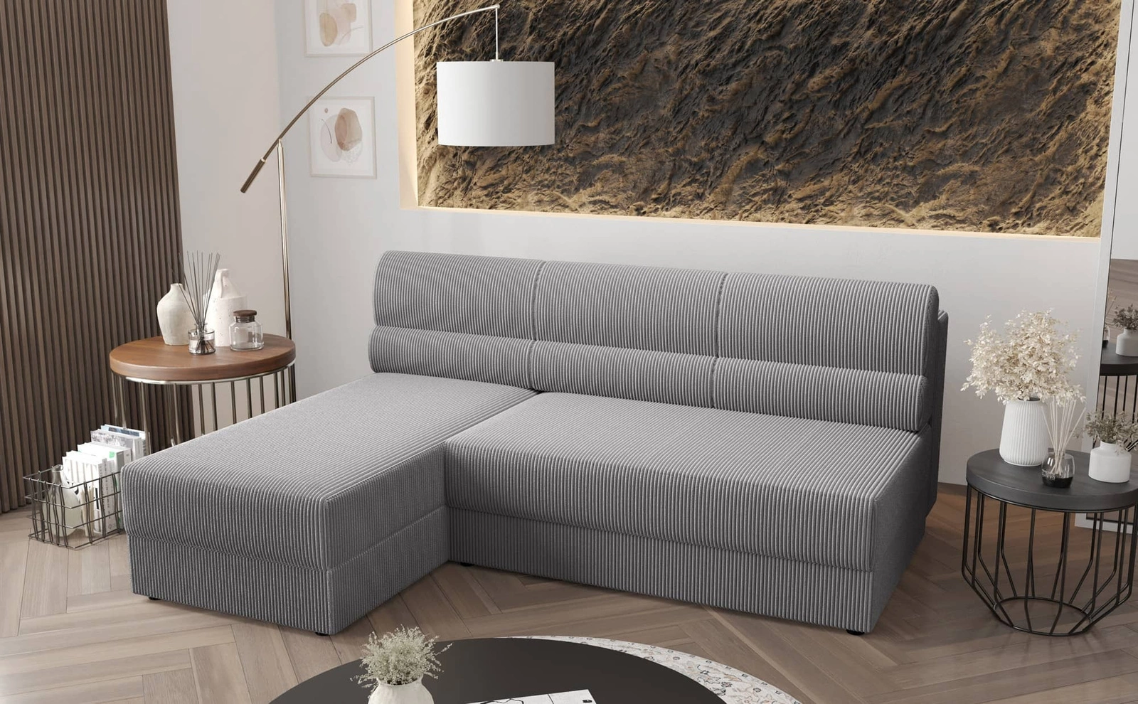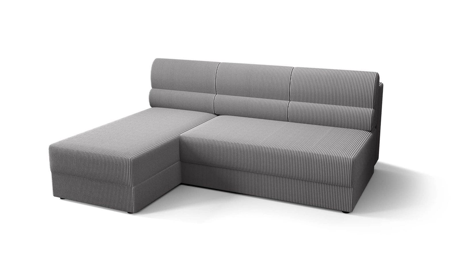 Rohová sedací souprava s funkcí spaní Fogu šedý jasan levá rohová sedací souprava s jednoduchým designem potažená manšestrovou látkovou nádobou na lůžkoviny