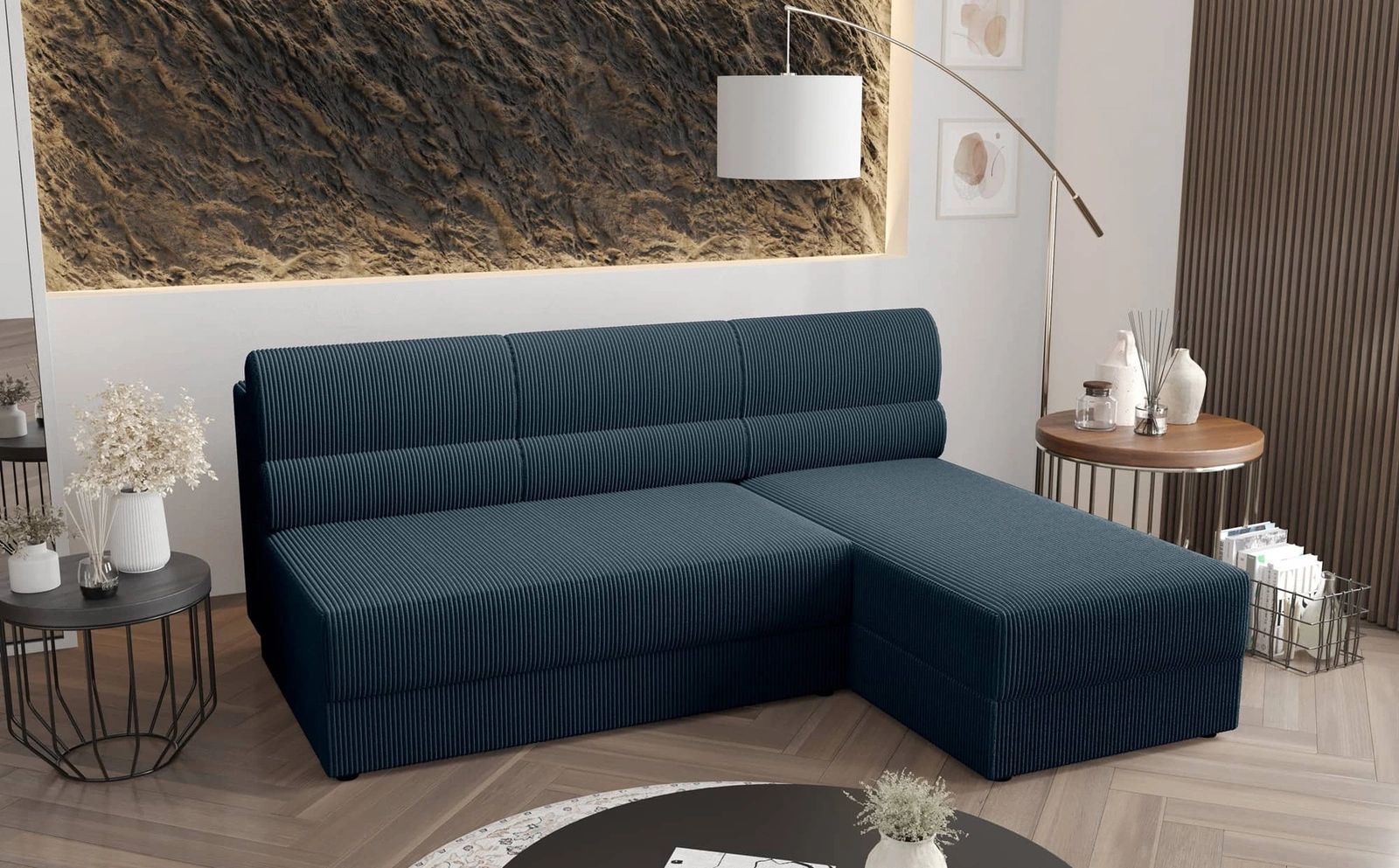 Rohová sedací souprava s funkcí spaní Fogu modrá pravostranná stylová rohová sedací souprava s jednoduchým designem potažená nádobou na lůžkoviny z manšestrové látky