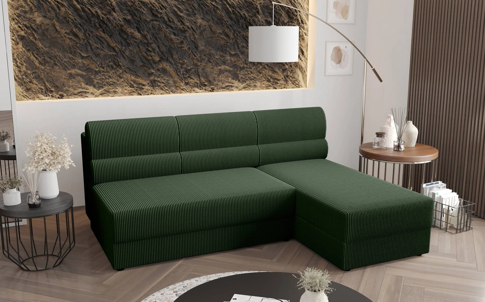 Rohová sedací souprava s funkcí spaní Fogu zelená pravá strana stylová rohová sedací souprava s jednoduchým designem potažená nádobou na lůžkoviny z manšestrové tkaniny